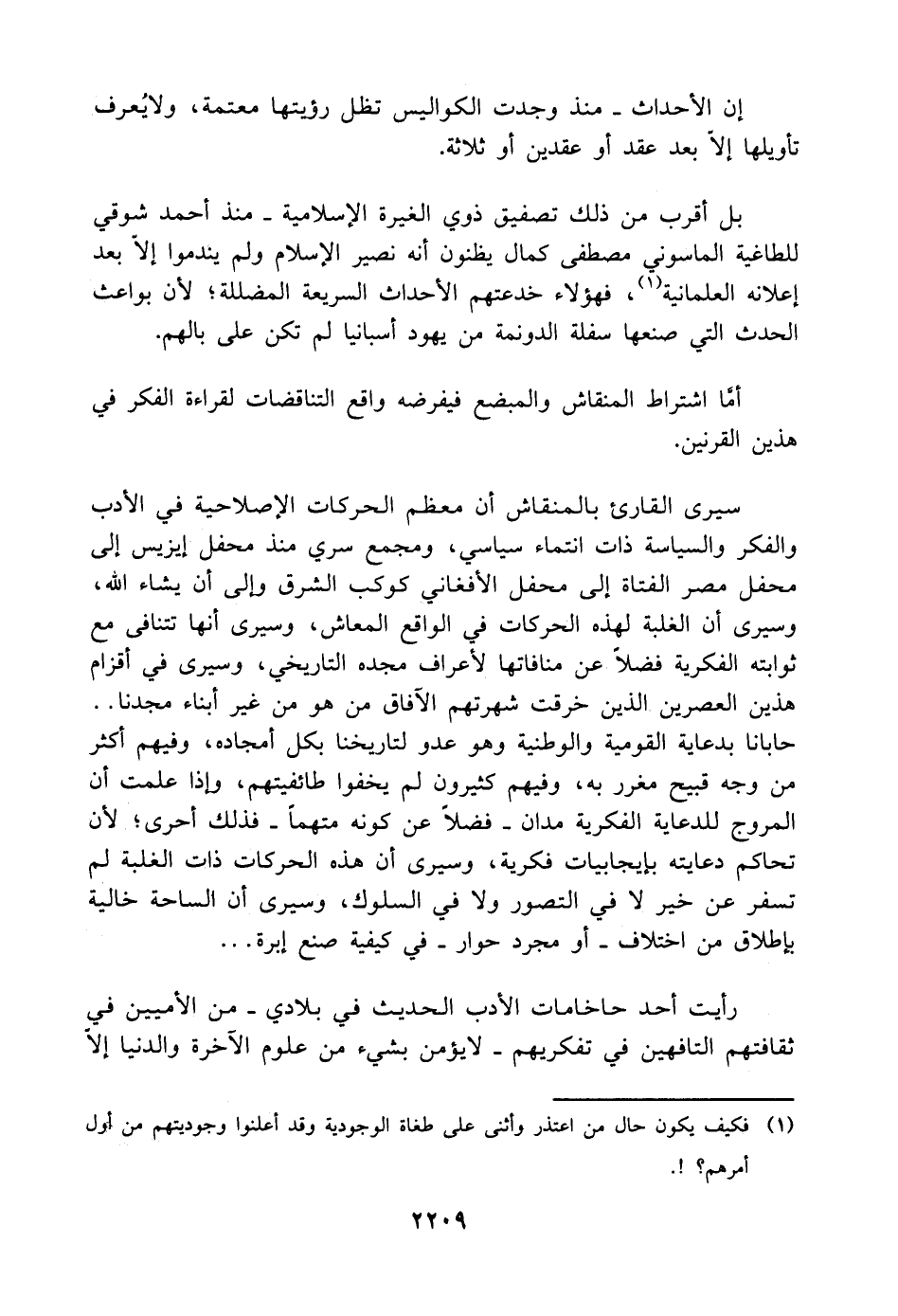 سيرى القارئ بالمنقاش أن معظم الحركات الإصلاحية في الأدب والفكر والسياسة ذات انتماء سياسي، ومجمع سري منذ محفل إيزيس إلى محفل مصر الفتاة إلى محفل الأفغاني كوكب الشرق وإلى أن يشاء اللَّه، وسيرى أن الغلبة لهذه الحركات في الواقع المعاش، وسيرى أنها تتنافى مع ثوابته الفكرية فضلًا عن منافاتها لأعراف مجده التاريخي، وسيرى في أقزام هذين العصرين الذين خرقت شهرتهم الآفاق من هو من غير أبناء مجدنا. . حابانا بدعاية القومية والوطنية وهو عدو لتاريخنا بكل أمجاده، وفيهم أكثر من وجه قبيح مغرر به، وفيهم كثيرون لم يخفوا طائفيتهم، وإذا علمت أن المروج للدعاية الفكرية مدان -فضلًا عن كونه متهمًا- فذلك أحرى؛ لأن تحاكم دعايته بإيجابيات فكرية، وسيرى أن هذه الحركات ذات الغلبة لم تسفر عن خير لا في التصور ولا في السلوك، وسيرى أن الساحة خالية بإطلاق من اختلاف -أو مجرد حوار- في كيفية صنع إبرة. . .
