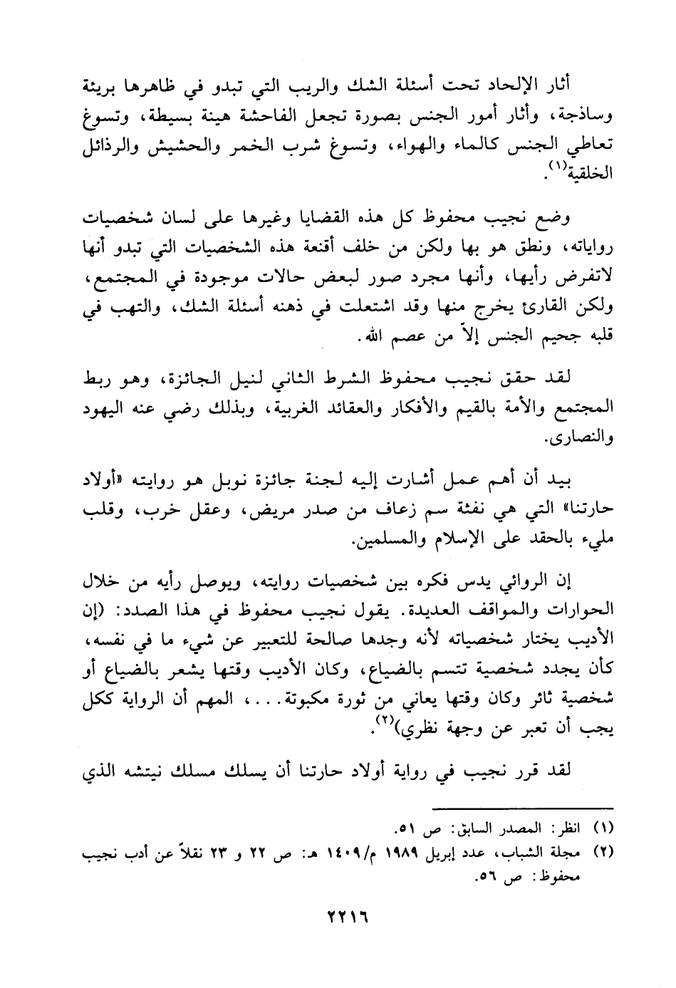 (¬٢) مجلة الشباب، عدد إبريل ١٩٨٩ م/ ١٤٠٩ هـ: ص ٢٢ و ٢٣ نقلًا عن أدب نجيب محفوظ: ص ٥٦.