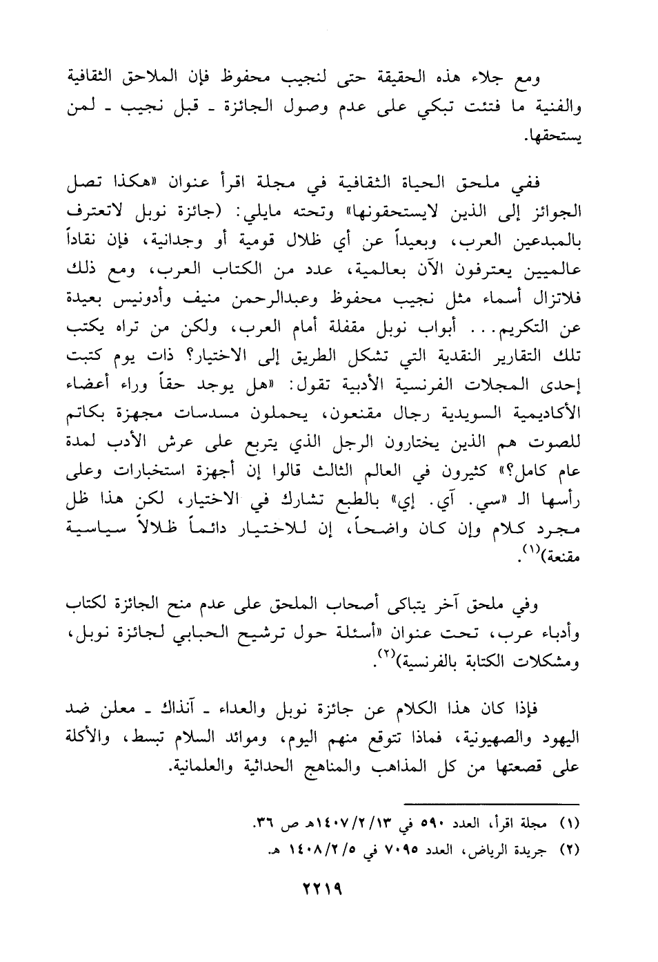 ففي ملحق الحياة الثقافية في مجلة اقرأ عنوان "هكذا تصل الجوائز إلى الذين لا يستحقونها" وتحته ما يلي: (جائزة نوبل لا تعترف بالمبدعين العرب، وبعيدًا عن أي ظلال قومية أو وجدانية، فإن نقادًا عالميين يعترفون الآن بعالمية، عدد من الكتاب العرب، ومع ذلك فلا تزال أسماء مثل نجيب محفوظ وعبد الرحمن منيف وأدونيس بعيدة عن التكريم. . . أبواب نوبل مقفلة أمام العرب، ولكن من تراه يكتب تلك التقارير النقدية التي تشكل الطريق إلى الاختيار؟ ذات يوم كتبت إحدى المجلات الفرنسية الأدبية تقول: "هل يوجد حقًا وراء أعضاء الأكاديمية السويدية رجال مقنعون، يحملون مسدسات مجهزة بكاتم للصوت هم الذين يختارون الرجل الذي يتربع على عرش الأدب لمدة عام كامل؟ " كثيرون في العالم الثالث قالوا إن أجهزة استخبارات وعلى رأسها الـ "سي. آي. إي" بالطبع تشارك في الاختيار، لكن هذا ظل مجرد كلام وإن كان واضحًا، إن للاختيار دائمًا ظلالًا سياسية مقنعة) (¬١).
