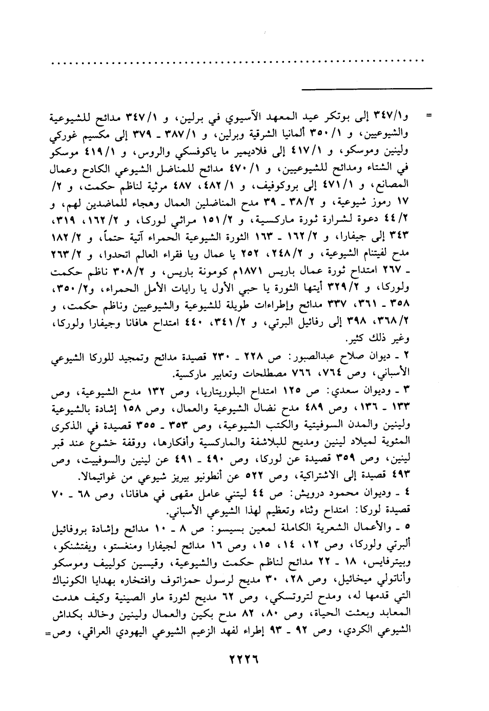 ٣ - وديوان سعدي: ص ١٢٥ امتداح البلوريتاريا، وص ١٣٢ مدح الشيوعية، وص ١٣٣ - ١٣٦، وص ٤٨٩ مدح نضال الشيوعية والعمال، وص ١٥٨ إشادة بالشيوعية ولينين والمدن السوفيتية والكتب الشيوعية، وص ٣٥٣ - ٣٥٥ قصيدة في الذكرى المئوية لميلاد لينين ومديح للبلاشفة والماركسية وأفكارها، ووقفة خشوع عند قبر لينين، وص ٣٥٩ قصيدة عن لوركا، وص ٤٩٠ - ٤٩١ عن لينين والسوفييت، وص ٤٩٣ قصيدة إلى الاشتراكية، وص ٥٢٢ عن أنطونيو بيريز شيوعي من غواتيمالا.