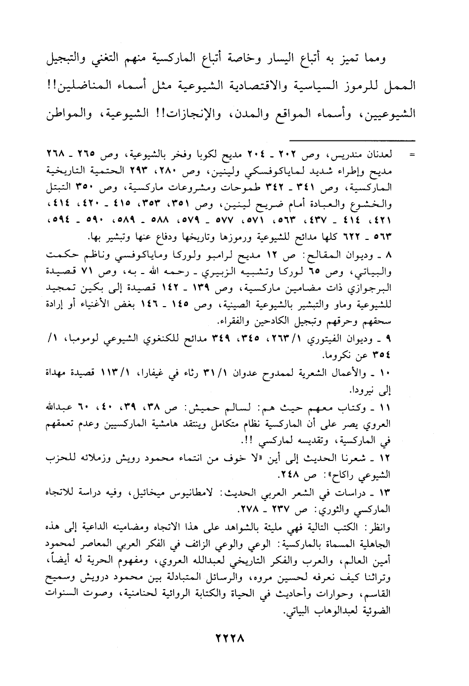 وانظر: الكتب التالية فهي مليئة بالواهد على هذا الاتجاه ومضامينه الداعية إلى هذه الجاهية المسماة بالماركسية: الوعي والوعي الزائف في الفكر العربي المعاصر لمحمود أمين العالم، والعرب والفكر التاريخي لعبد اللَّه العروي، ومفهوم الحرية له أيضًا، وتراثنا كيف نعرفه لحسين مروه، والرسائل المتبادلة بين محمود درويش وسميح القاسم، وحرارات وأحاديث في الحياة والكتابة الروائية لحنامنية، وصوت السنوات الضوئية لعبد الوهاب البياتي.
