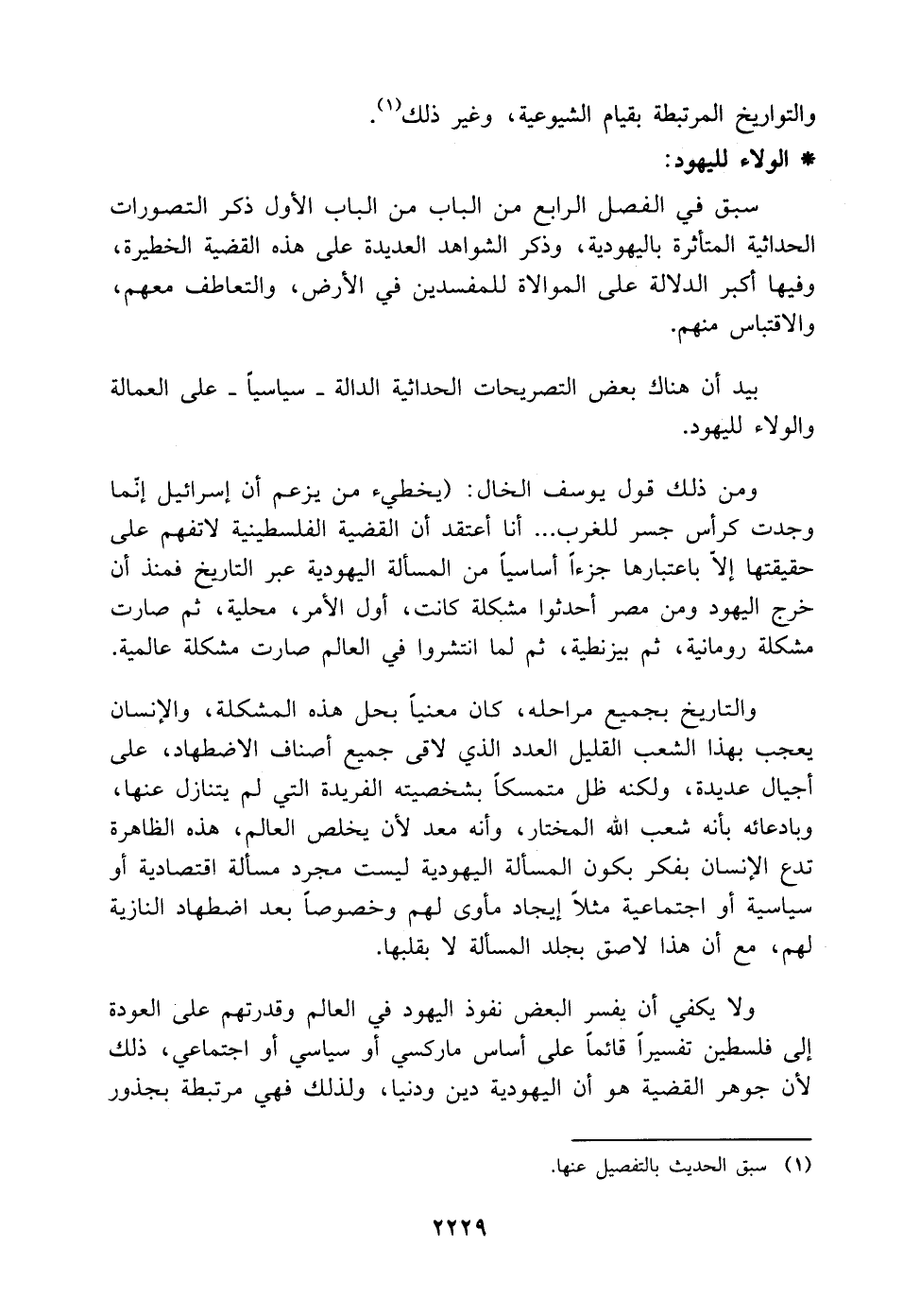 ولا يكفي أن يفسر البعض نفوذ اليهود في العالم وقدرتهم على العودة إلى فلسطين تفسيرًا قائمًا على أساس ماركسي أو سياسي أو اجتماعي، ذلك لأن جوهر القضية هو أن اليهودية دين ودنيا، ولذلك فهي مرتبطة بجذور