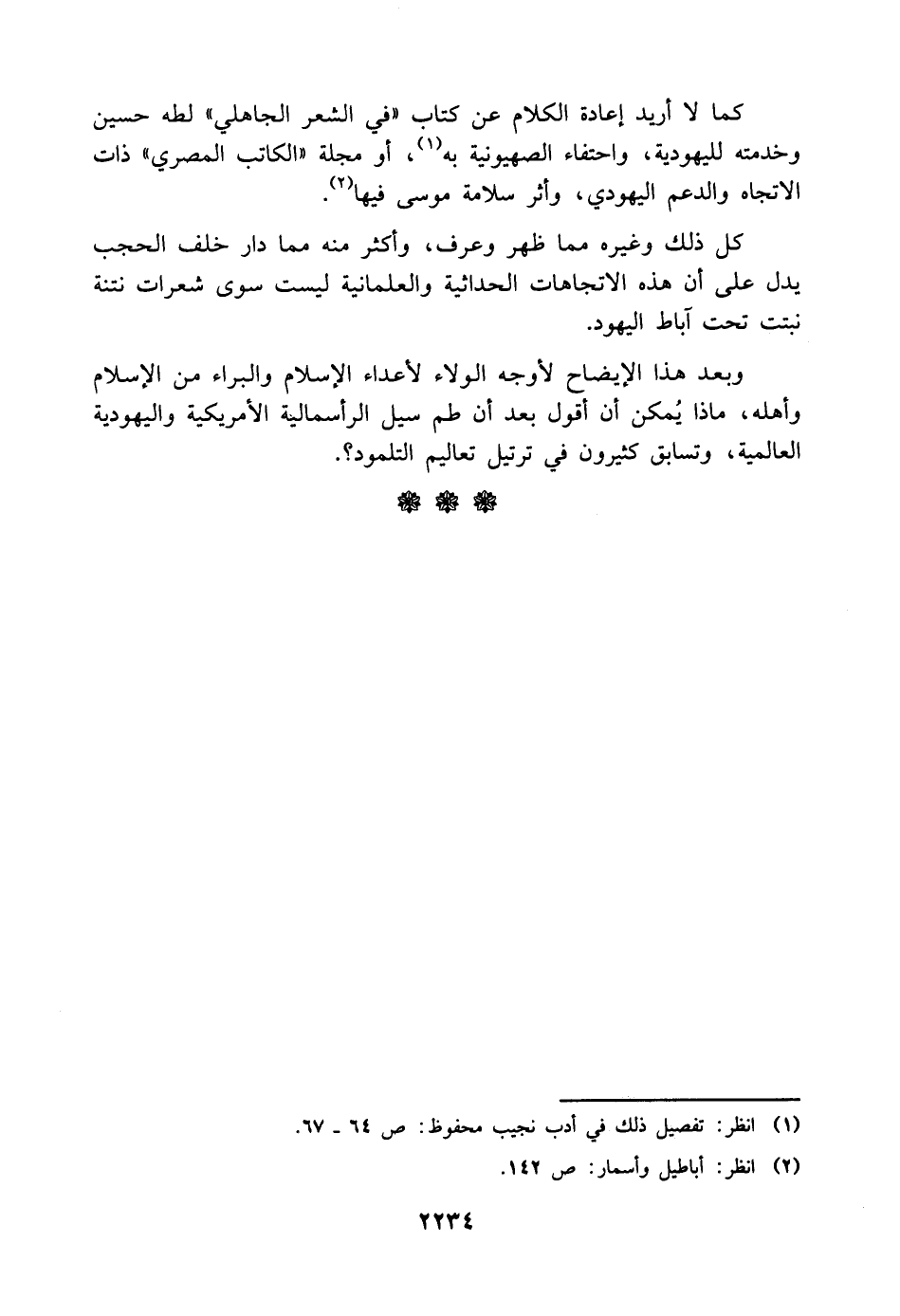 كما لا أريد إعادة الكلام عن كتاب "في الشعر الجاهلي" لطه حسين وخدمته لليهودية، واحتفاء الصهيونية به (¬١)، أو مجلة "الكاتب المصري" ذات الاتجاه والدعم اليهودي، وأثر سلامة موسى فيها (¬٢).