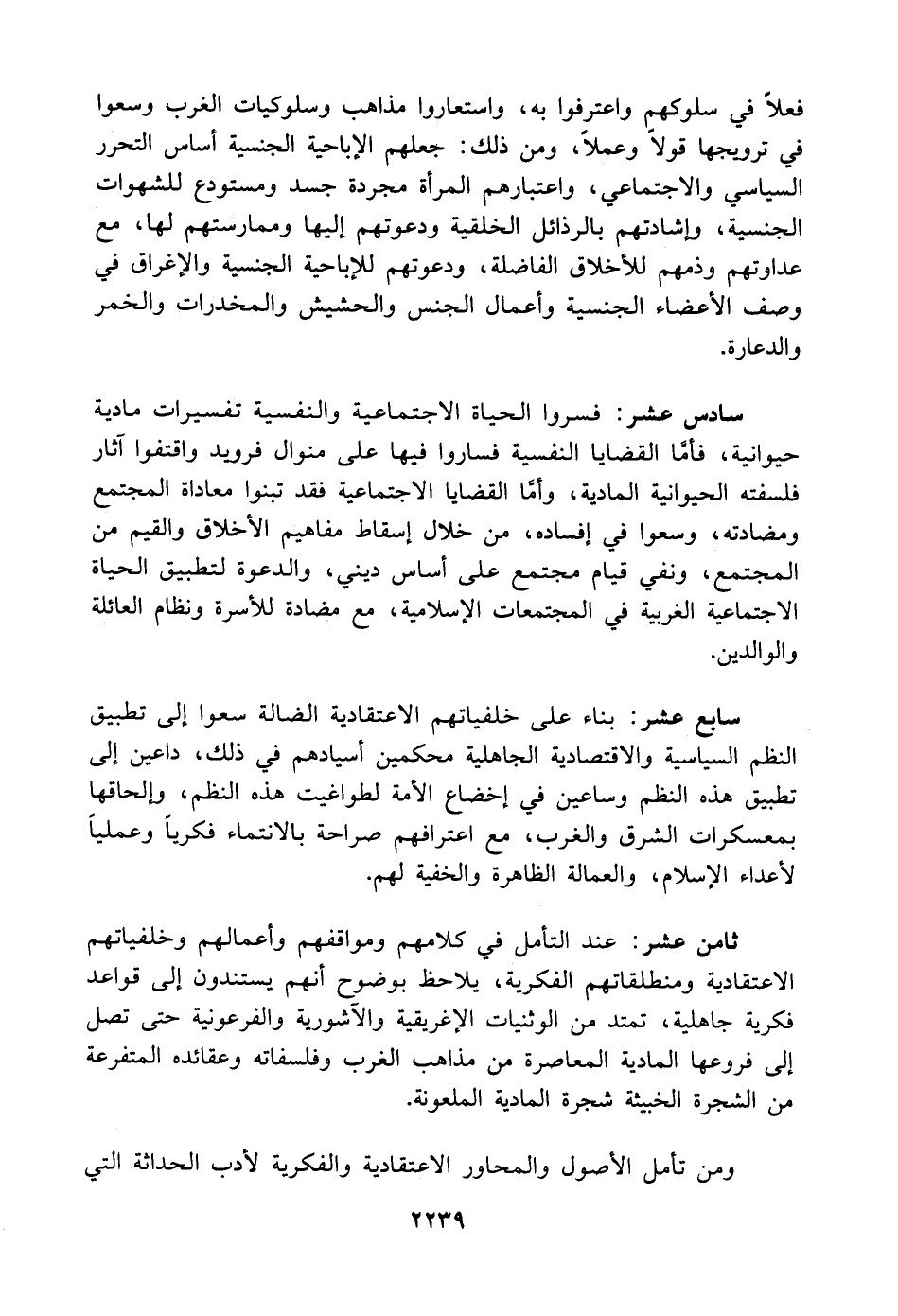 ثامن عشر: عند التأمل في كلامهم ومواقفهم وأعمالهم وخلفياتهم الاعتقادية ومنطلقاتهم الفكرية، يلاحظ بوضوح أنهم يستندون إلى قواعد فكرية جاهلية، تمتد من الوثنيات الإغريقية والآشورية والفرعونية حتى تصل إلى فروعها المادية المعاصرة من مذاهب الغرب وفلسفاته وعقائده المتفرعة من الشجرة الخبيثة شجرة المادية الملعونة.