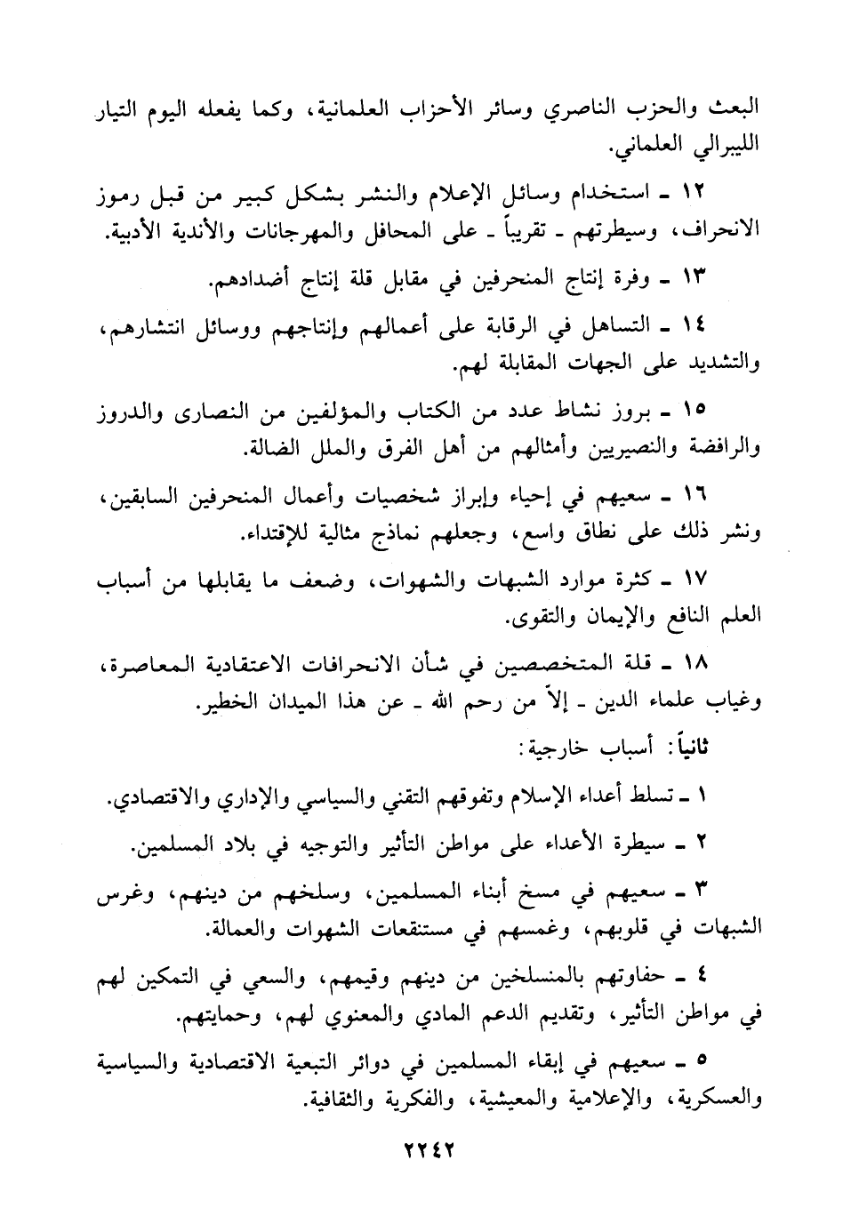 ١٨ - قلة المتخصصين في شأن الانحرافات الاعتقادية المعاصرة، وغياب علماء الدين -إلَّا من رحم اللَّه- عن هذا الميدان الخطير.