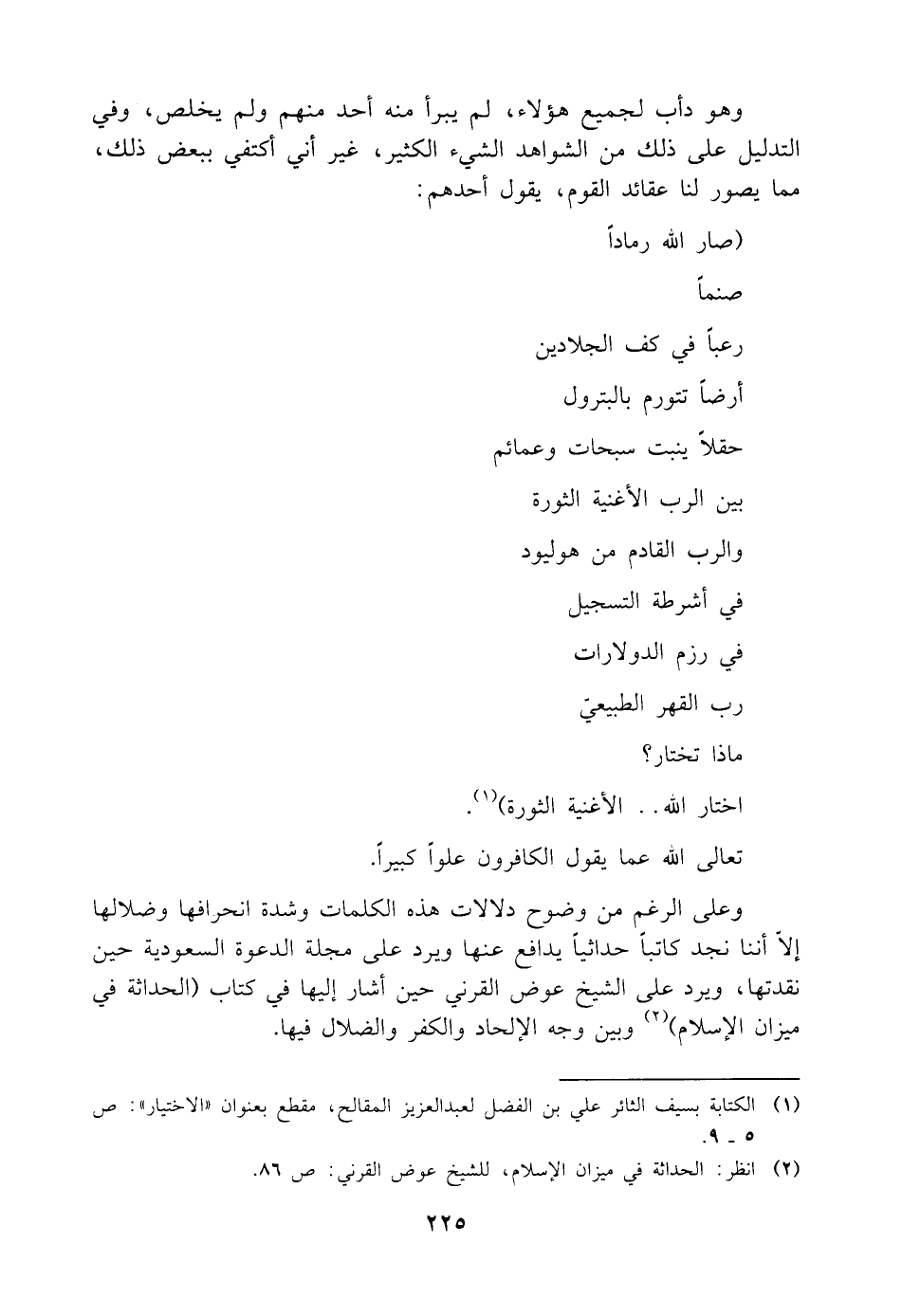وعلى الرغم من وضوح دلالات هذه الكلمات وشدة انحرافها وضلالها إلّا أننا نجد كاتبًا حداثيًا يدافع عنها ويرد على مجلة الدعوة السعودية حين نقدتها، ويرد على الشيخ عوض القرني حين أشار إليها في كتاب (الحداثة في ميزان الإسلام) (¬٢) وبين وجه الإلحاد والكفر والضلال فيها.