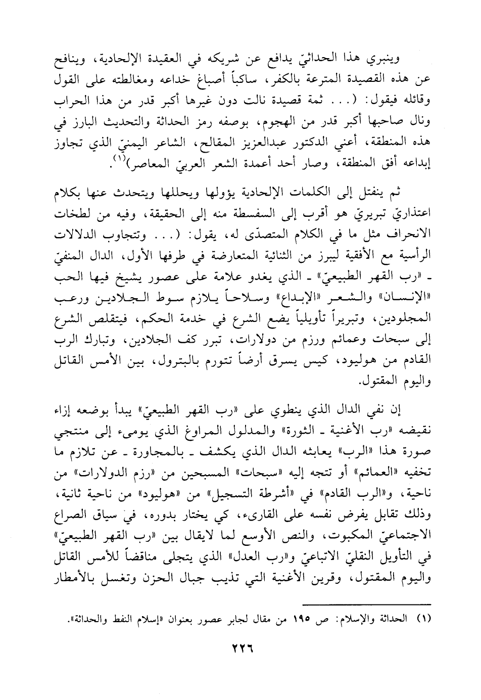 ثم ينفتل إلى الكلمات الإلحادية يؤولها ويحللها ويتحدث عنها بكلام اعتذاريّ تبريريّ هو أقرب إلى السفسطة منه إلى الحقيقة، وفيه من لطخات الانحراف مثل ما في الكلام المتصدّى له، يقول: (. . . وتتجاوب الدلالات الرأسية مع الأفقية ليبرز من الثنائية المتعارضة في طرفها الأول، الدال المنفيّ -"رب القهر الطبيعي"- الذي يغدو علامة على عصور يشيخ فيها الحب "الإنسان" والشعر "الإبداع" وسلاحًا يلازم سوط الجلادين ورعب المجلودين، وتبريرًا تأويليًا يضع الشرع في خدمة الحكم، فيتقلص الشرع إلى سبحات وعمائم ورزم من دولارات، تبرر كف الجلادين، وتبارك الرب القادم من هوليود، كيس يسرق أرضًا تتورم بالبترول، بين الأمس القاتل واليوم المقتول.
