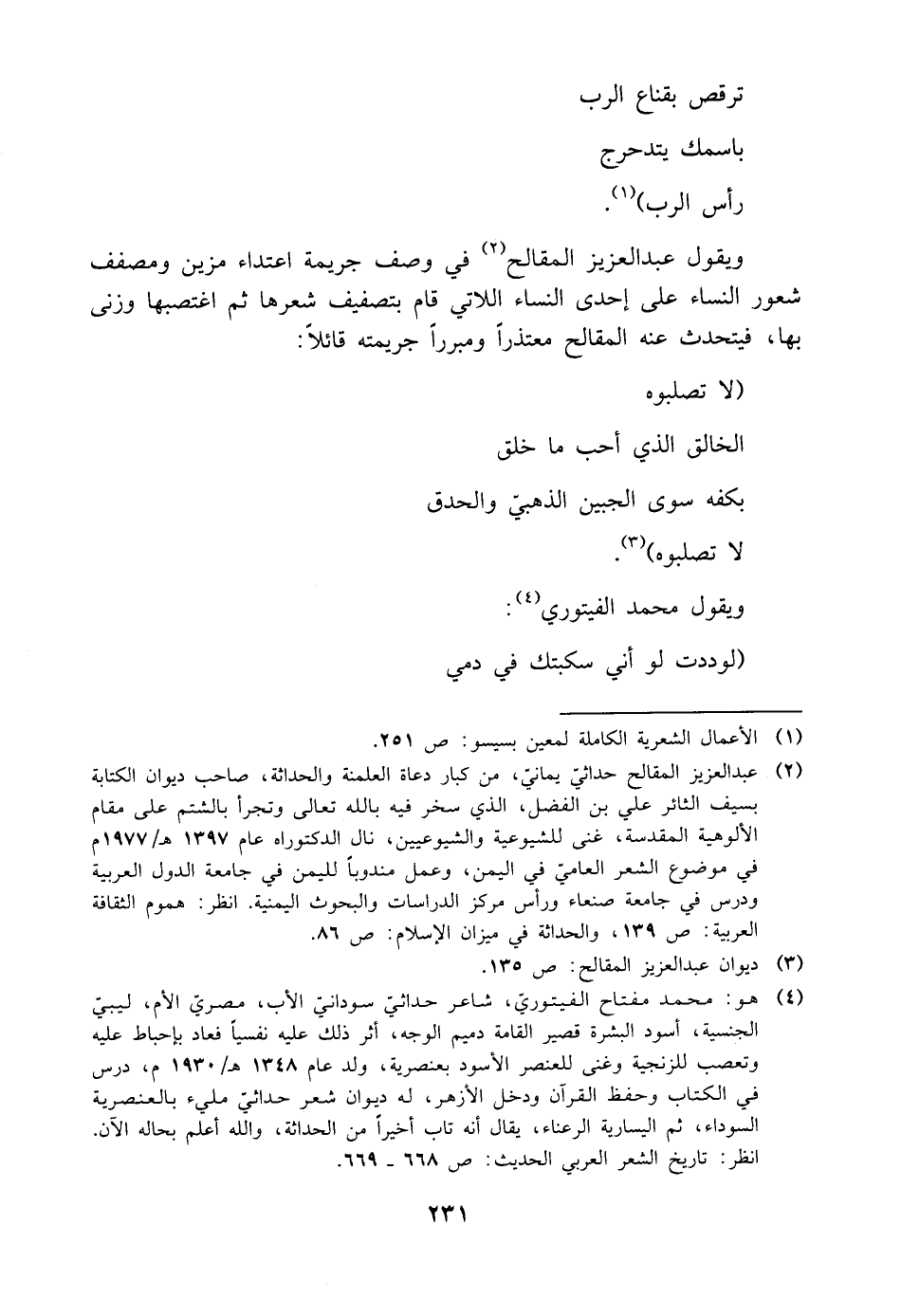 (¬٤) هو: محمد مفتاح الفيتوريّ، شاعر حداثيّ سودانيّ الأب، مصريّ الأم، ليبيّ الجنسية، أسود البشرة قصير القامة دميم الوجه، ألْر ذلك عليه نفسيًا فعاد بإحباط عليه وتعصب للزنجية وغنى للعنصر الأسود بعنصرية، ولد عام ١٣٤٨ هـ/ ١٩٣٠ م، درس في الكتاب وحفظ القرآن ودخل الأزهر، له ديوان شعر حداثيّ مليء بالعنصرية السوداء، ثم اليسارية الرعناء، يقال أنه تاب أخيرًا من الحداثة، واللَّه أعلم بحاله الآن. انظر: تاريخ الشعر العربي الحديث: ص ٦٦٨ - ٦٦٩.