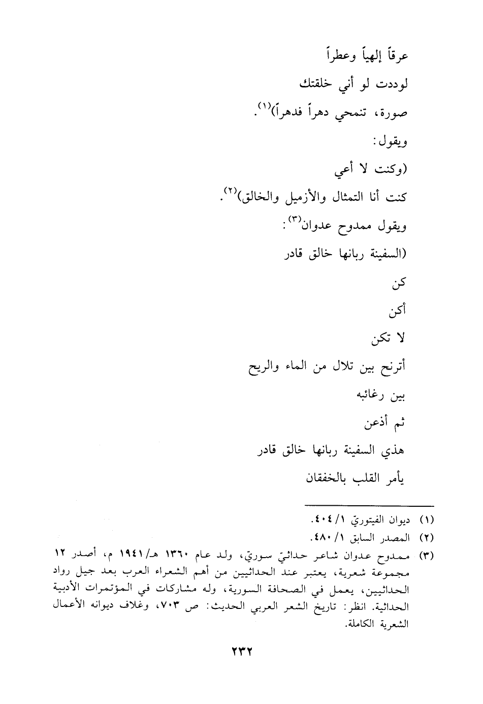 (¬٣) ممدوح عدوان شاعر حداثيّ سوريّ، ولد عام ١٣٦٠ هـ/ ١٩٤١ م، أصدر ١٢ مجموعة شعرية، يعتبر عند الحداثيين من أهم الشعراء العرب بعد جيل رواد الحداثيين، يعمل في الصحافة السورية، وله مشاركات في المؤتمرات الأدبية الحداثية. انظر: تاريخ الشعر العربي الحديث: ص ٧٠٣، وغلاف ديوانه الأعمال الشعرية الكاملة.