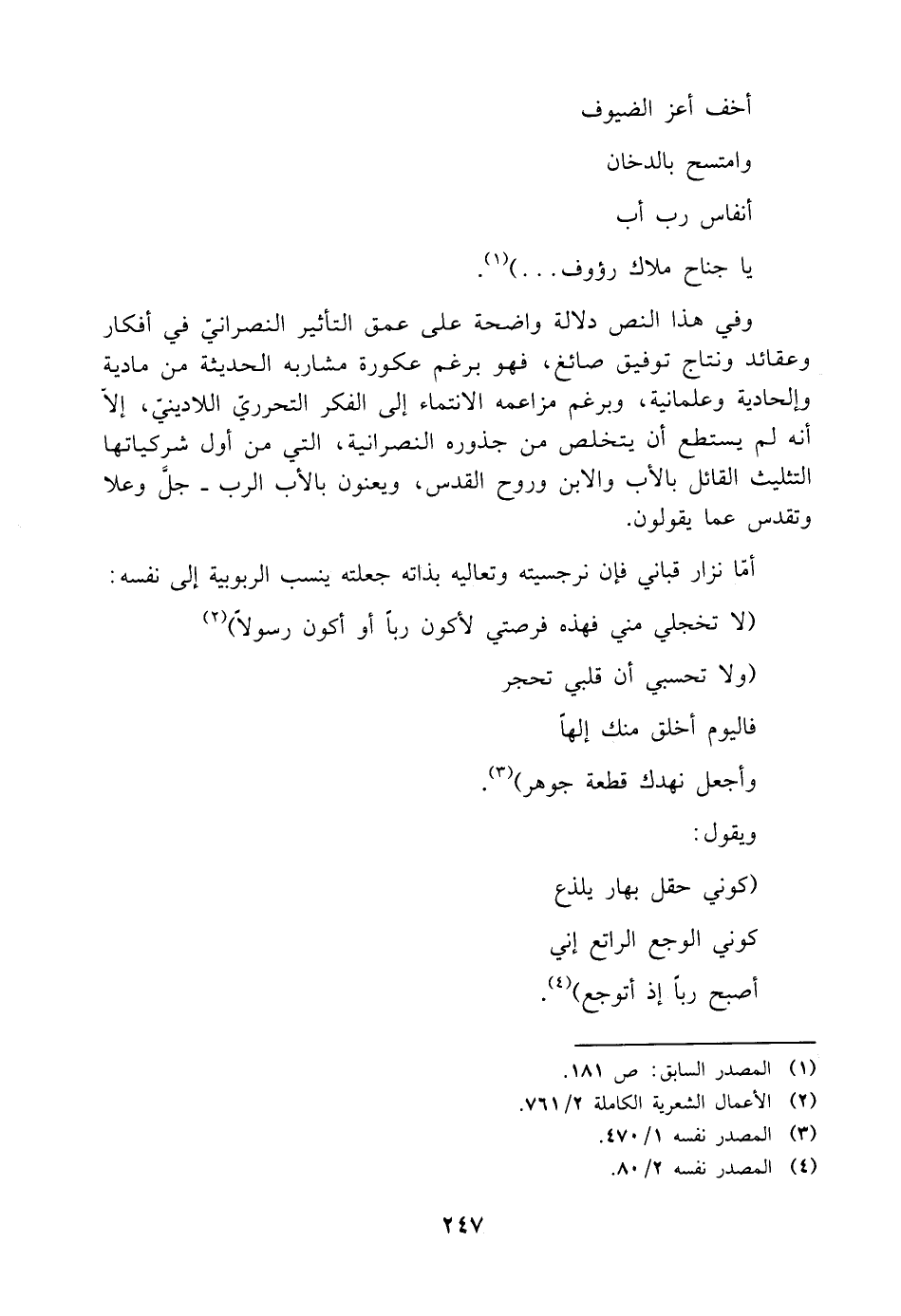 أمّا نزار قباني فإن نرجسيته وتعاليه بذاته جعلته ينسب الربوبية إلى نفسه: