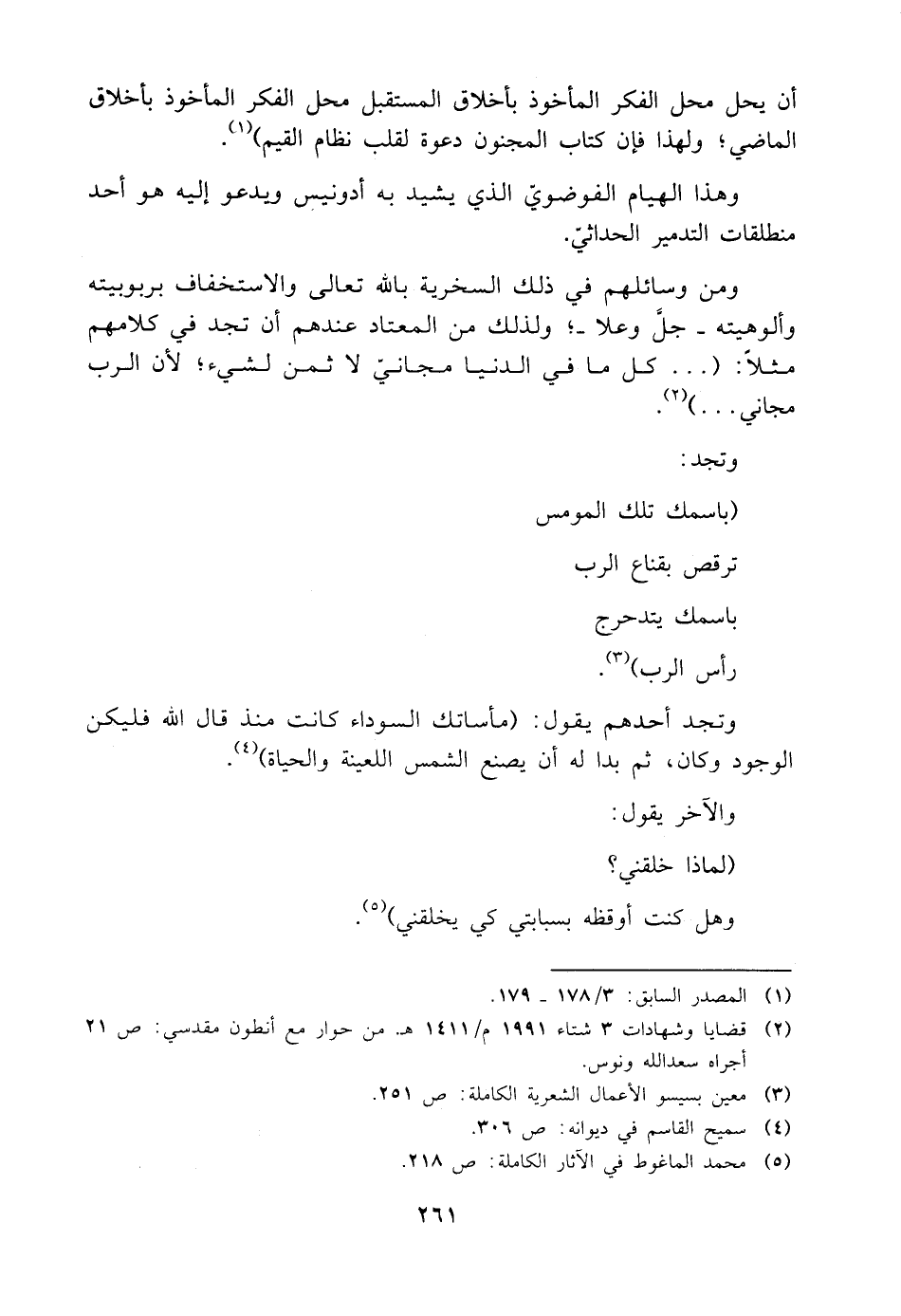 وتجد أحدهم يقول: (مأساتك السوداء كانت منذ قال اللَّه فليكن الوجود وكان، ثم بدا له أن يصنع الشمس اللعينة والحياة) (¬٤).