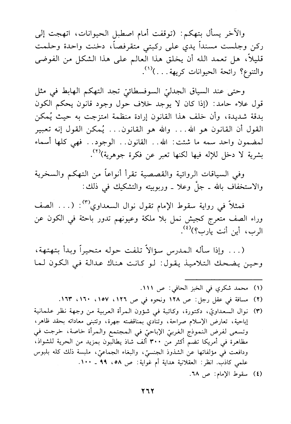 (¬٣) نوال السعداويّ، دكتورة، وكاتبة في شؤون المرأة العربية من وجهة نظر علمانية إباحية، تعارض الإسلام صراحة، وتنادي بمناقضته جهرة، وتتبنى معاداته بحقد ظاهر، وتسعى لفرض النموذج الغربي الإباحي في المجتمع والمرأة خاصة، خرجت في مظاهرة في أمريكا تضم أكثر من ٣٠٠ ألف شاذ يطالبون بمزيد من الحرية للشواذ، ودافعت في مؤلفاتها عن الشذوذ الجنسيّ، والبغاء الجماعيّ، ملبسة ذلك كله بلبوس علمي كاذب. انظر: العقلانية هداية أم غواية: ص ٥٨، ٩٩ - ١٠٠.
