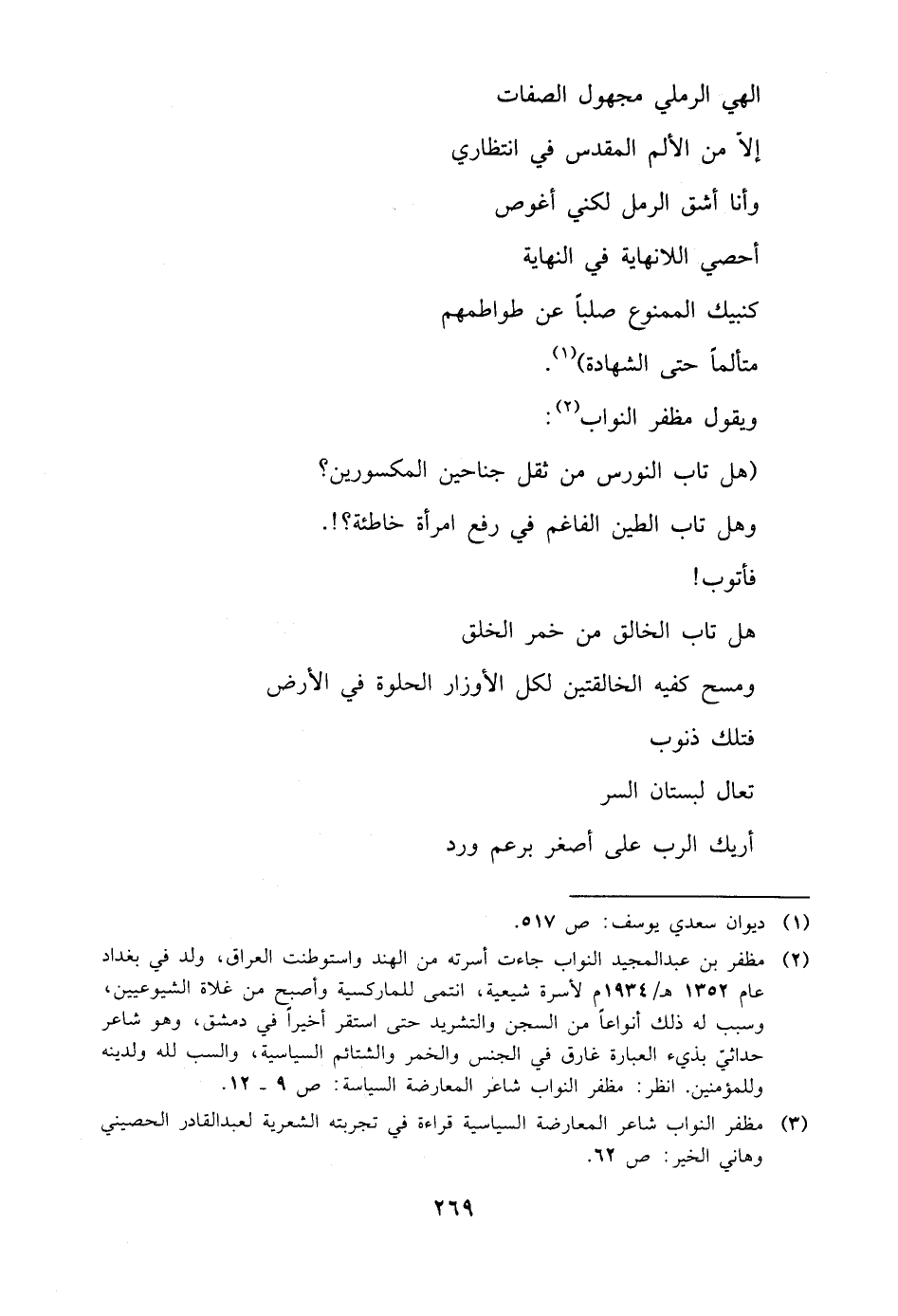 (¬٢) مظفر بن عبد المجيد النواب جاءت أسرته من الهند واستوطنت العراق، ولد في بغداد عام ١٣٥٢ هـ/ ١٩٣٤ م لأسرة شيعية، انتمى للماركسية وأصبح من غلاة الشيوعيين، وسبب له ذلك أنواعًا من السجن والتشريد حتى استقر أخيرًا في دمشق، وهو شاعر حداثيّ بذيء العبارة غارق في الجنس والخمر والشتائم السياسية، والسب للَّه ولدينه وللمؤمنين. انظر: مظفر النواب شاعر المعارضة السياسة: ص ٩ - ١٢.