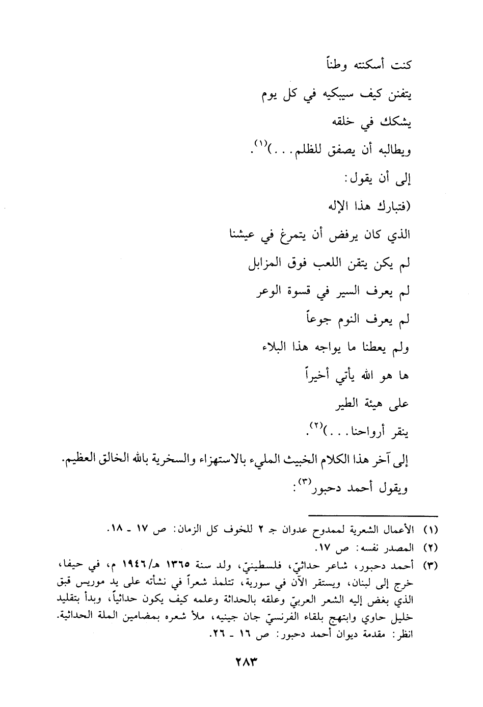 (¬٣) أحمد دحبور، شاعر حداثيّ، فلسطينيّ، ولد سنة ١٣٦٥ هـ/ ١٩٤٦ م، في حيفا، خرج إلى لبنان، ويستقر الآن في سورية، تتلمذ شعرًا في نشأته على يد موريس قبق الذي بغض إليه الشعر العربيّ وعلقه بالحداثة وعلمه كيف يكون حداثيًا، وبدأ بتقليد خليل حاوي واتهج بلقاء الفرنسيّ جان جينيه، ملأ شعره بمضامين الملة الحداثية. انظر: مقدمة ديوان أحمد دحبور: ص ١٦ - ٢٦.