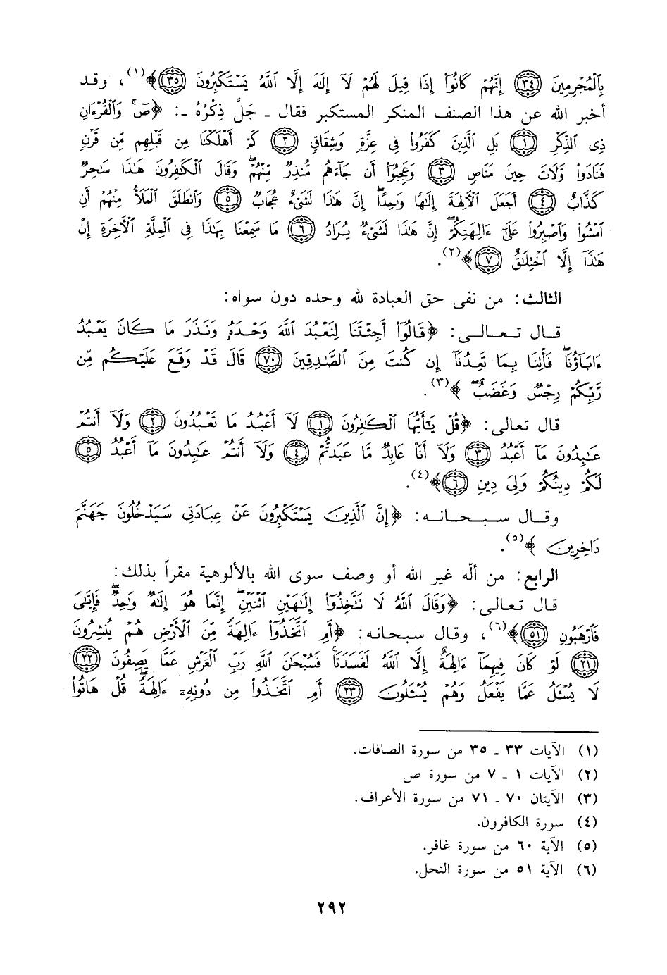 بِالْمُجْرِمِينَ (٣٤) إِنَّهُمْ كَانُوا إِذَا قِيلَ لَهُمْ لَا إِلَهَ إِلَّا اللَّهُ يَسْتَكْبِرُونَ (٣٥)} (¬١)، وقد أخبر اللَّه عن هذا الصنف المنكر المستكبر فقال -جَلَّ ذِكْرُهُ-: {ص وَالْقُرْآنِ ذِي الذِّكْرِ (١) بَلِ الَّذِينَ كَفَرُوا فِي عِزَّةٍ وَشِقَاقٍ (٢) كَمْ أَهْلَكْنَا مِنْ قَبْلِهِمْ مِنْ قَرْنٍ فَنَادَوْا وَلَاتَ حِينَ مَنَاصٍ (٣) وَعَجِبُوا أَنْ جَاءَهُمْ مُنْذِرٌ مِنْهُمْ وَقَالَ الْكَافِرُونَ هَذَا سَاحِرٌ كَذَّابٌ (٤) أَجَعَلَ الْآلِهَةَ إِلَهًا وَاحِدًا إِنَّ هَذَا لَشَيْءٌ عُجَابٌ (٥) وَانْطَلَقَ الْمَلَأُ مِنْهُمْ أَنِ امْشُوا وَاصْبِرُوا عَلَى آلِهَتِكُمْ إِنَّ هَذَا لَشَيْءٌ يُرَادُ (٦) مَا سَمِعْنَا بِهَذَا فِي الْمِلَّةِ الْآخِرَةِ إِنْ هَذَا إِلَّا اخْتِلَاقٌ (٧)} (¬٢).