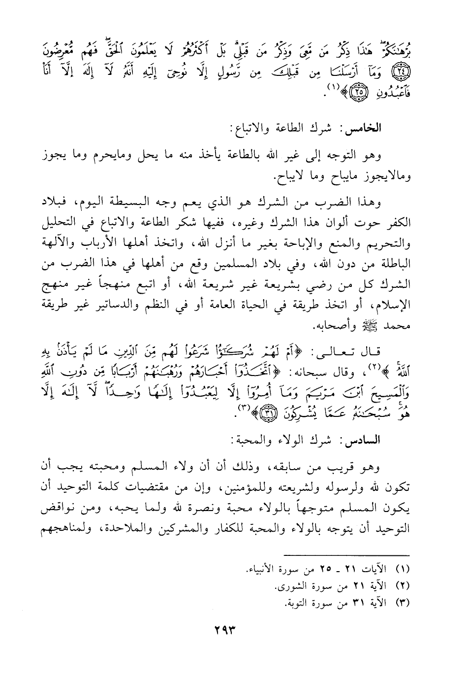 قال تعالى: {أَمْ لَهُمْ شُرَكَاءُ شَرَعُوا لَهُمْ مِنَ الدِّينِ مَا لَمْ يَأْذَنْ بِهِ اللَّهُ} (¬٢)، وقال سبحانه: {اتَّخَذُوا أَحْبَارَهُمْ وَرُهْبَانَهُمْ أَرْبَابًا مِنْ دُونِ اللَّهِ وَالْمَسِيحَ ابْنَ مَرْيَمَ وَمَا أُمِرُوا إِلَّا لِيَعْبُدُوا إِلَهًا وَاحِدًا لَا إِلَهَ إِلَّا هُوَ سُبْحَانَهُ عَمَّا يُشْرِكُونَ (٣١)} (¬٣).