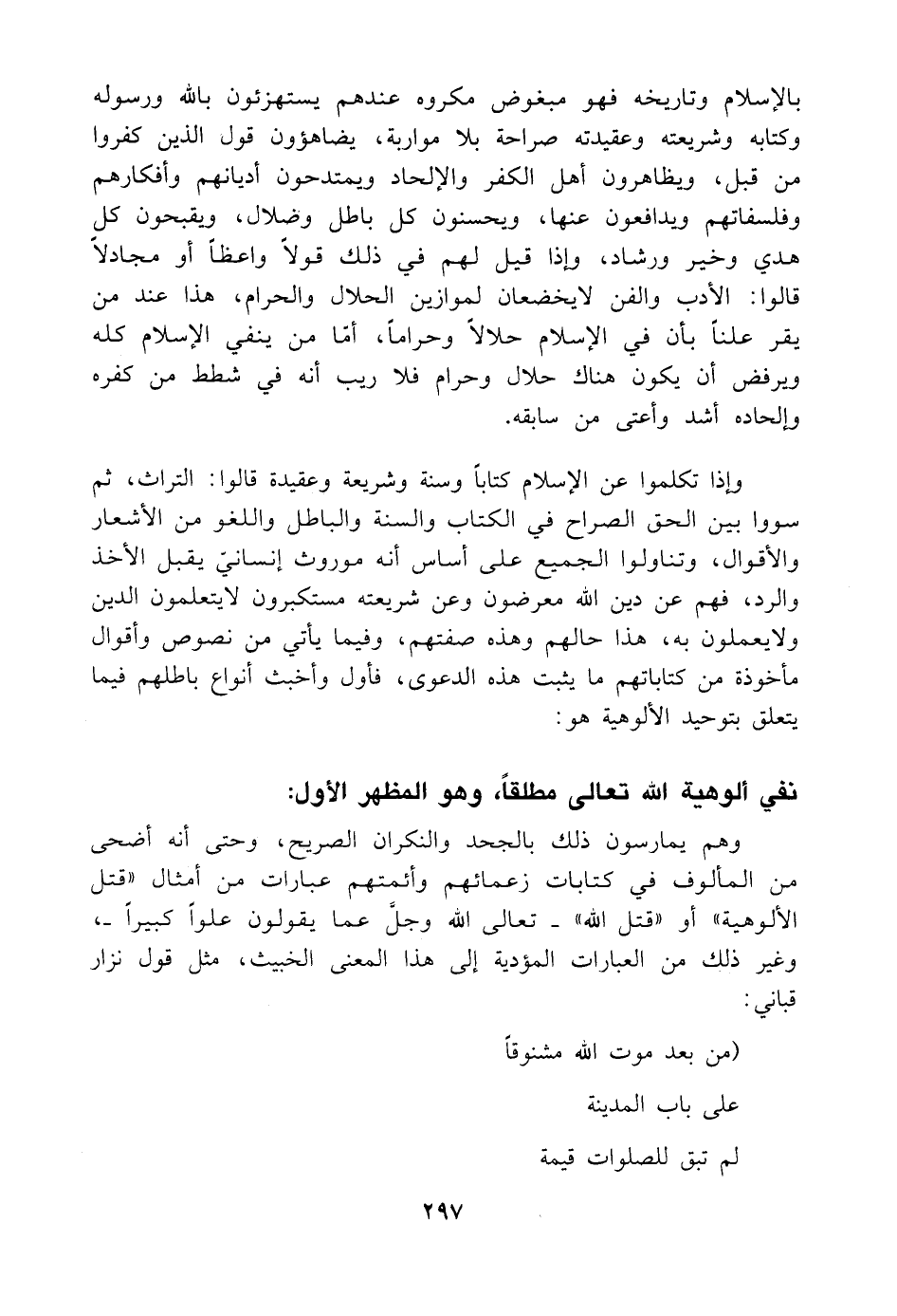 وإذا تكلموا عن الإسلام كتابًا وسنة وشريعة وعقيدة قالوا: التراث، ثم سووا بين الحق الصراح في الكتاب والسنة والباطل واللغو من الأشعار والأقوال، وتناولوا الجميع على أساس أنه موروث إنساني يقبل الأخذ والرد، فهم عن دين اللَّه معرضون وعن شريعته مستكبرون لا يتعلمون الدين ولا يعملون به، هذا حالهم وهذه صفتهم، وفيما يأتي من نصوص وأقوال مأخوذة من كتاباتهم ما يثبت هذه الدعوى، فأول وأخبث أنواع باطلهم فيما يتعلق بتوحيد الألوهية هو: