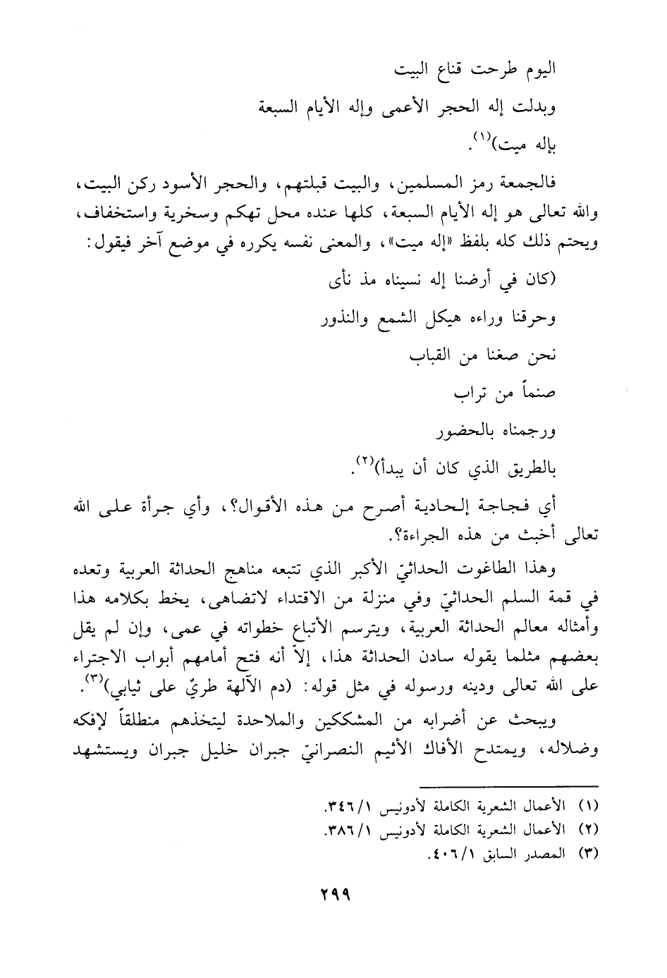 وهذا الطاغوت الحداثيّ الأكبر الذي تتبعه مناهج الحداثة العربية وتعده في قمة السلم الحداثيّ وفي منزلة من الاقتداء لا تضاهى، يخط بكلامه هذا وأمثاله معالم الحداثة العربية، ويترسم الأتباع خطواته في عمى، وإن لم يقل بعضهم مثلما يقوله سادن الحداثة هذا، إلّا أنه فتح أمامهم أبواب الاجتراء على اللَّه تعالى ودينه ورسوله في مثل قوله: (دم الآلهة طريٌ على ثيابي) (¬٣).