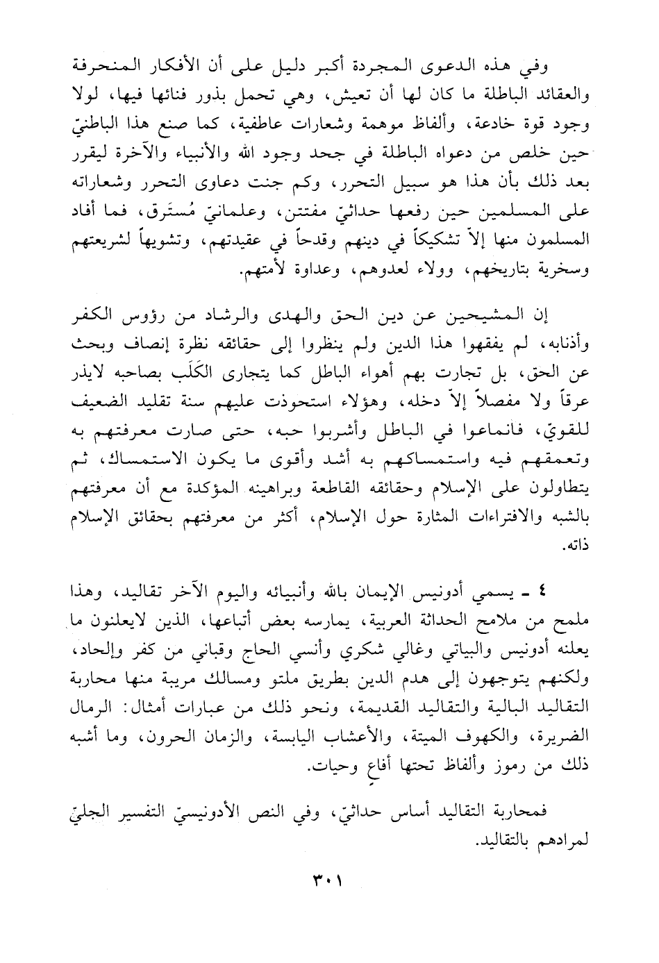 ٤ - يسمي أدونيس الإيمان باللَّه وأنبيائه واليوم الآخر تقاليد، وهذا ملمح من ملامح الحداثة العربية، يمارسه بعض أتباعها، الذين لا يعلنون ما يعلنه أدونيس والبياتي وغالي شكري وأنسي الحاج وقباني من كفر وإلحاد، ولكنهم يتوجهون إلى هدم الدين بطريق ملتو ومسالك مريبة منها محاربة التقاليد البالية والتقاليد القديمة، ونحو ذلك من عبارات أمثال: الرمال الضريرة، والكهوف الميتة، والأعشاب اليابسة، والزمان الحرون، وما أشبه ذلك من رموز وألفاظ تحتها أفاعٍ وحيات.