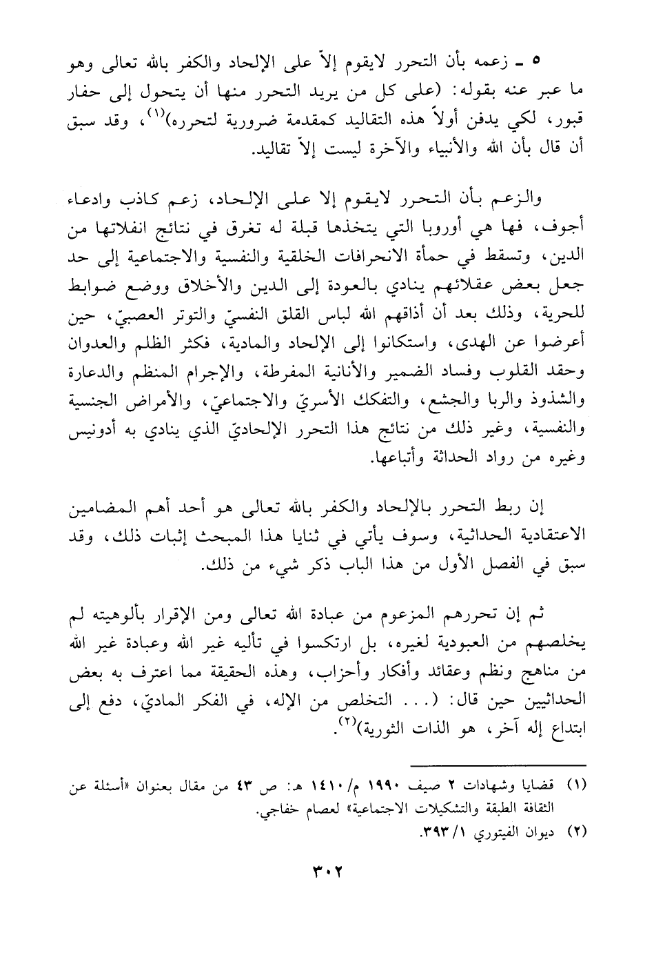 ثم إن تحررهم المزعوم من عبادة اللَّه تعالى ومن الإقرار بألوهيته لم يخلصهم من العبودية لغيره، بل ارتكسوا في تأليه غير اللَّه وعبادة غير اللَّه من مناهج ونظم وعقائد وأفكار وأحزاب، وهذه الحقيقة مما اعترف به بعض الحداثيين حين قال: (. . . التخلص من الإله، في الفكر الماديّ، دفع إلى ابتداع إله آخر، هو الذات الثورية) (¬٢).