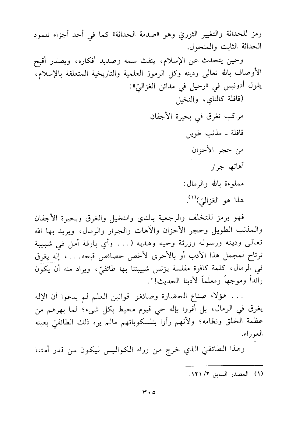فهو يرمز للتخلف والرجعية بالناي والنخيل والغرق وبحيرة الأجفان والمذنب الطويل وحجر الأحزان والآهات والجرار والرمال، ويريد بها اللَّه تعالى ودينه ورسوله وورثة وحيه وهديه (. . . وأي بارقة أمل في شبيبة ترتاح لمجمل هذا الأدب أو بالأحرى لأخص خصائص قبحه. . .، إله يغرق في الرمال، كلمة كافرة مفلسة يؤنس شبيبتنا بها طائفيّ، ويراد منه أن يكون رائدًا وموجهًا ومعلمًا لأدبنا الحديث! ! .