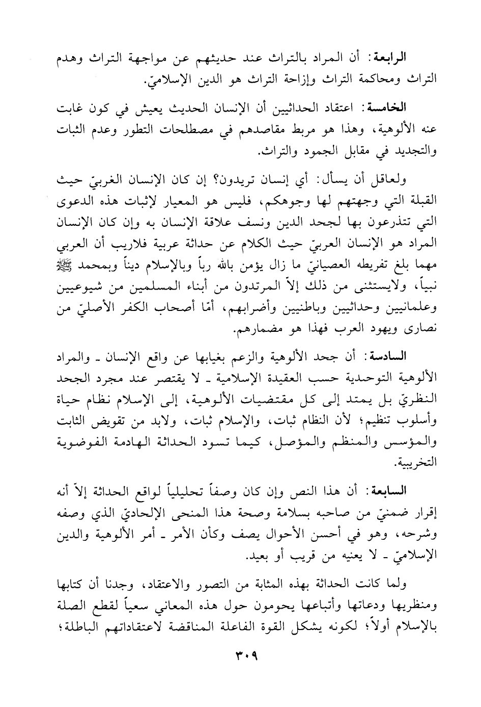 الرابعة: أن المراد بالتراث عند حديثهم عن مواجهة التراث وهدم التراث ومحاكمة التراث وإزاحة التراث هو الدين الإسلاميّ.