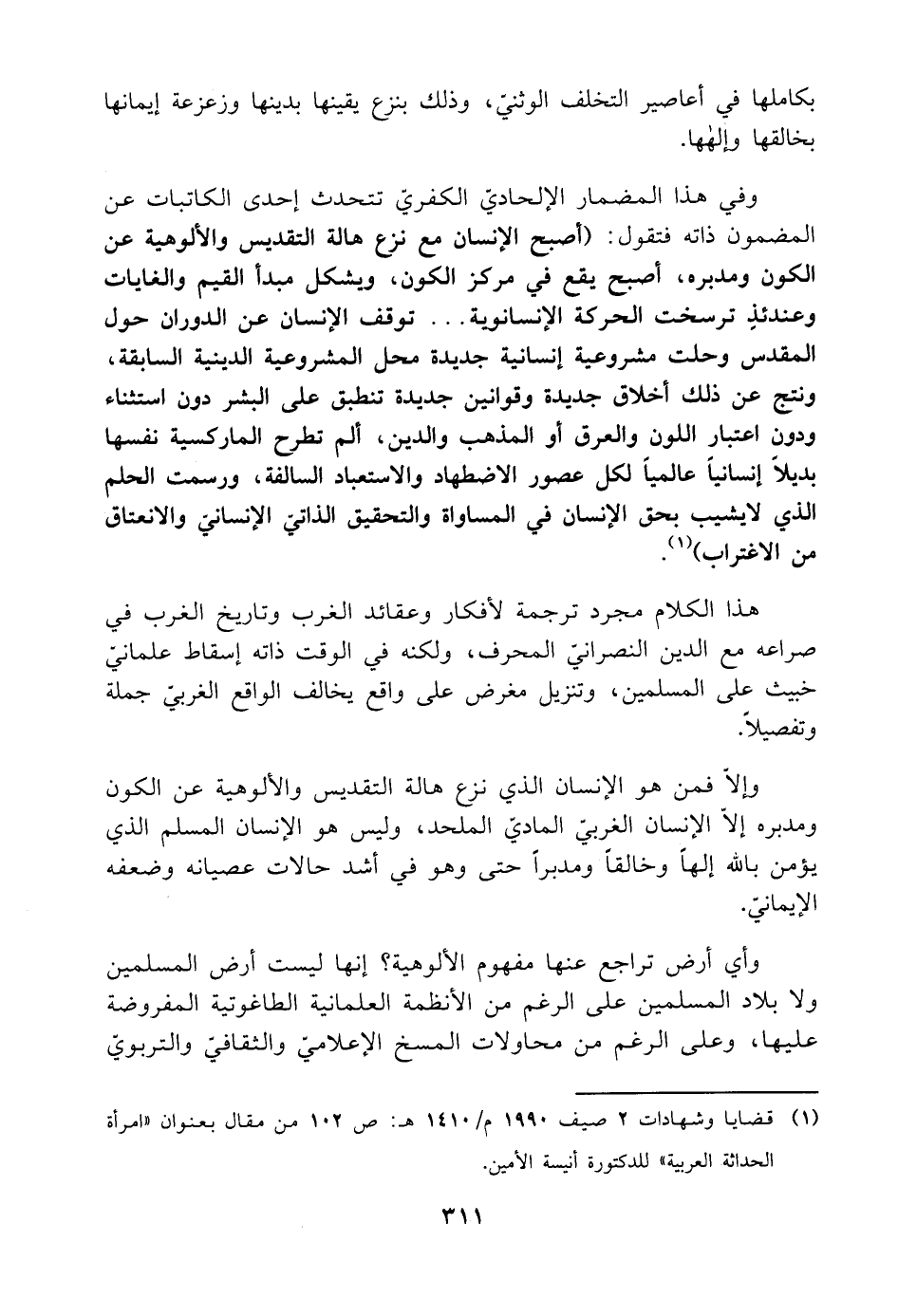 (¬١) قضايا وشهادات ٢ صيف ١٩٩٠ م/ ١٤١٠ هـ: ص ١٠٢ من مقال بعنوان "امرأة الحداثة العربية" للدكتورة أنيسة الأمين.