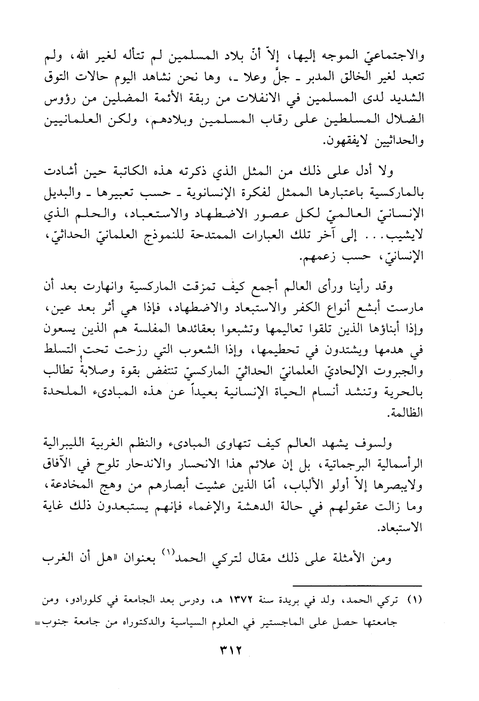 (¬١) تركي الحمد، ولد في بريدة سنة ١٣٧٢ هـ، ودرس بعد الجامعة في كلورادو، ومن جامعتها حصل على الماجستير في العلوم السياسية والدكتوراه من جامعة جنوب =