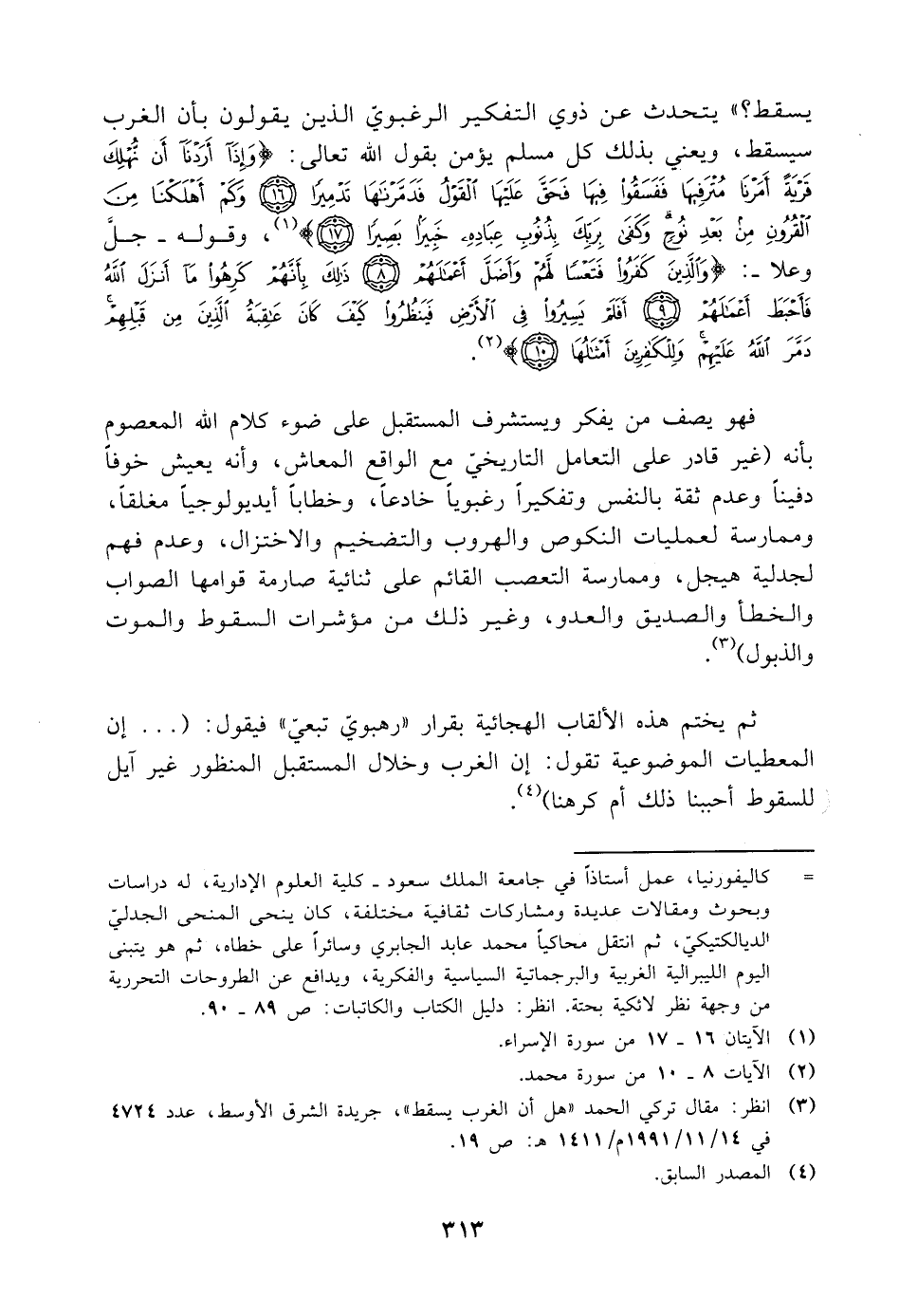 (¬٣) انظر: مقال تركي الحمد "هل أن الغرب يسقط"، جريدة الشرق الأوسط، عدد ٤٧٢٤ في ١٤/ ١١/ ١٩٩١ م/ ١٤١١ هـ: ص ١٩.