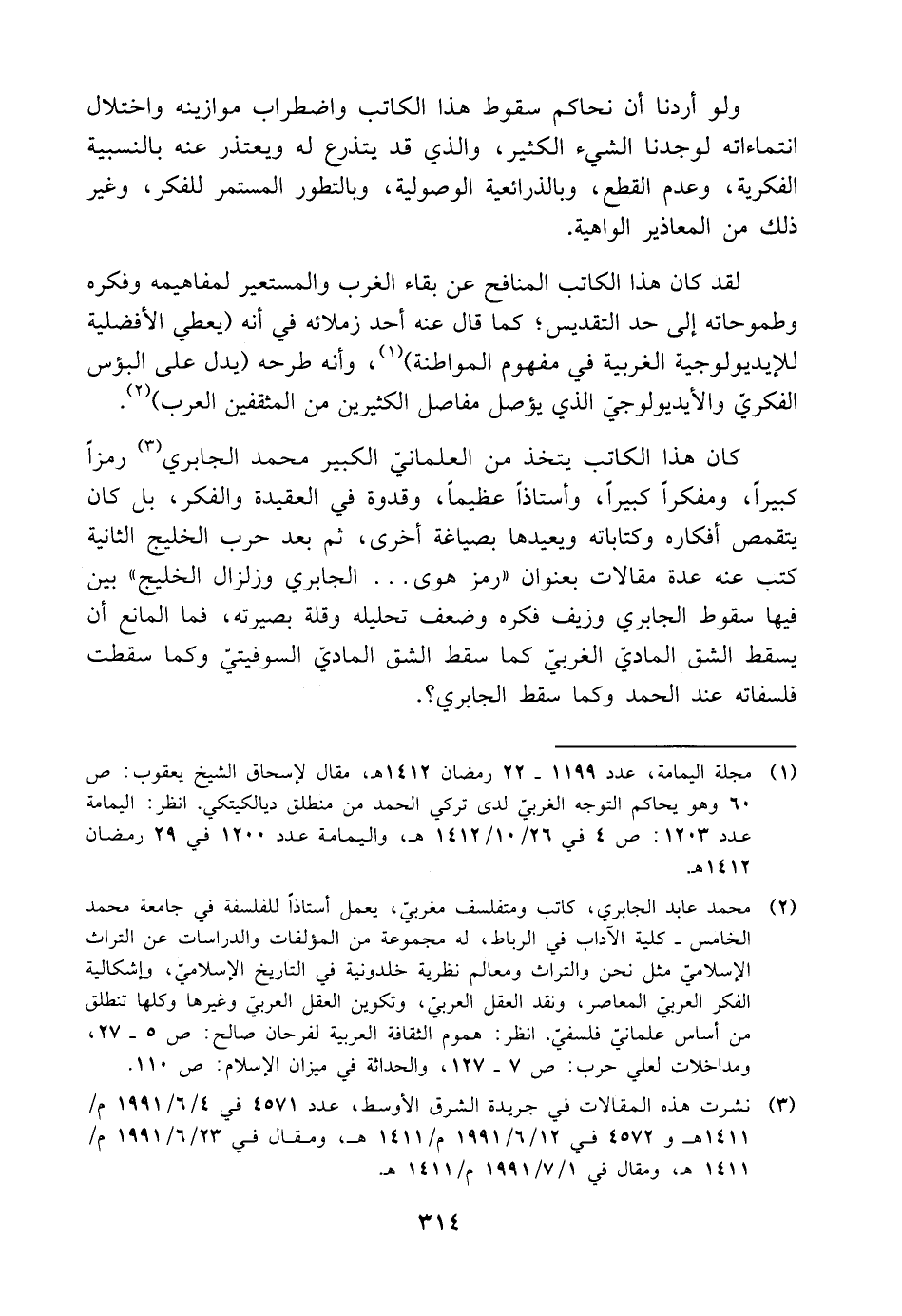 كان هذا الكاتب يتخذ من العلماني الكبير محمد الجابري (¬٣) رمزًا كبيرًا، ومفكرًا كبيرًا، وأستاذًا عظيمًا، وقدوة في العقيدة والفكر، بل كان يتقمص أفكاره وكتاباته ويعيدها بصياغة أخرى، ثم بعد حرب الخليج الثانية كتب عنه عدة مقالات بعنوان "رمز هوى. . . الجابري وزلزال الخليج" بين فيها سقوط الجابري وزيف فكره وضعف تحليله وقلة بصيرته، فما المانع أن يسقط الشق الماديّ الغربيّ كما سقط الشق الماديّ السوفيتيّ وكما سقطت فلسفاته عند الحمد وكما سقط الجابري؟ .