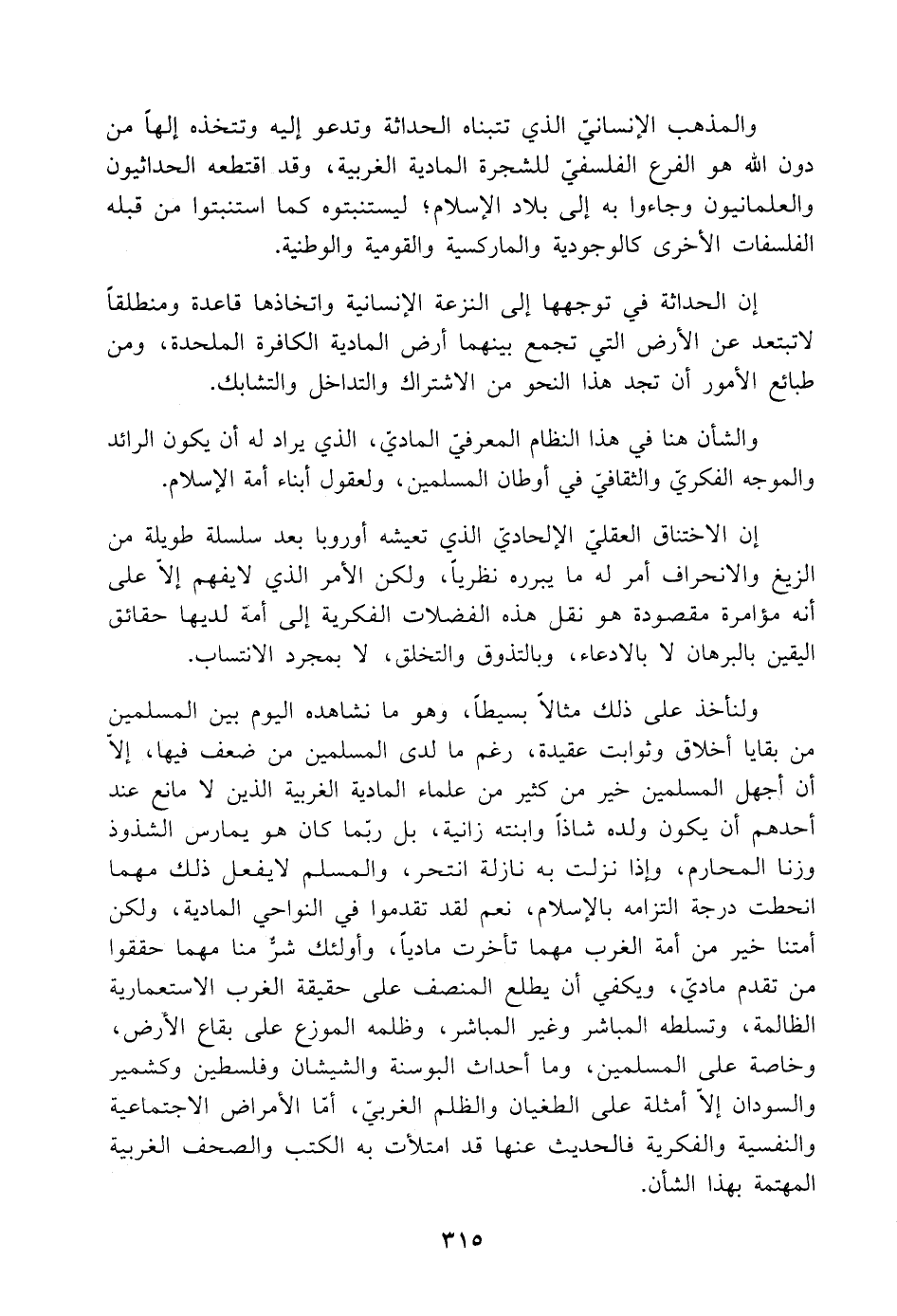إن الاختناق العقليّ الإلحاديّ الذي تعيشه أوروبا بعد سلسلة طويلة من الزيغ والانحراف أمر له ما يبرره نظريًا، ولكن الأمر الذي لا يفهم إلّا على أنه مؤامرة مقصودة هو نقل هذه الفضلات الفكرية إلى أمة لديهما حقائق اليقين بالبرهان لا بالادعاء، وبالتذوق والتخلق، لا بمجرد الانتساب.