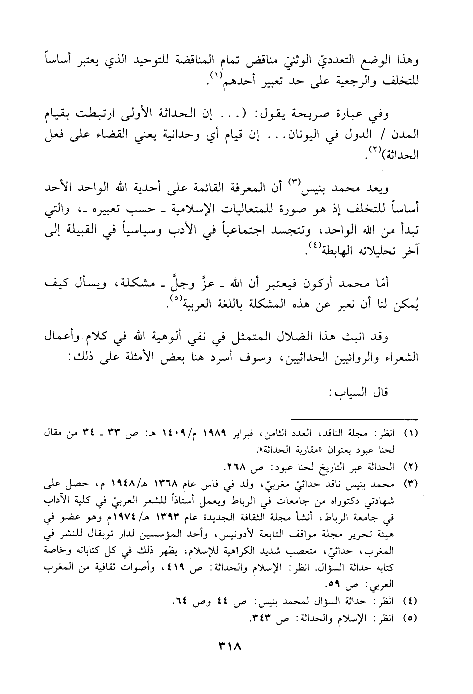 ويعد محمد بنيس (¬٣) أن المعرفة القائمة على أحدية اللَّه الواحد الأحد أساسًا للتخلف إذ هو صورة للمتعاليات الإسلامية -حسب تعبيره-، والتي تبدأ من اللَّه الواحد، وتتجسد اجتماعيًا في الأدب وسياسيًا في القبيلة إلى آخر تحليلاته الهابطة (¬٤).