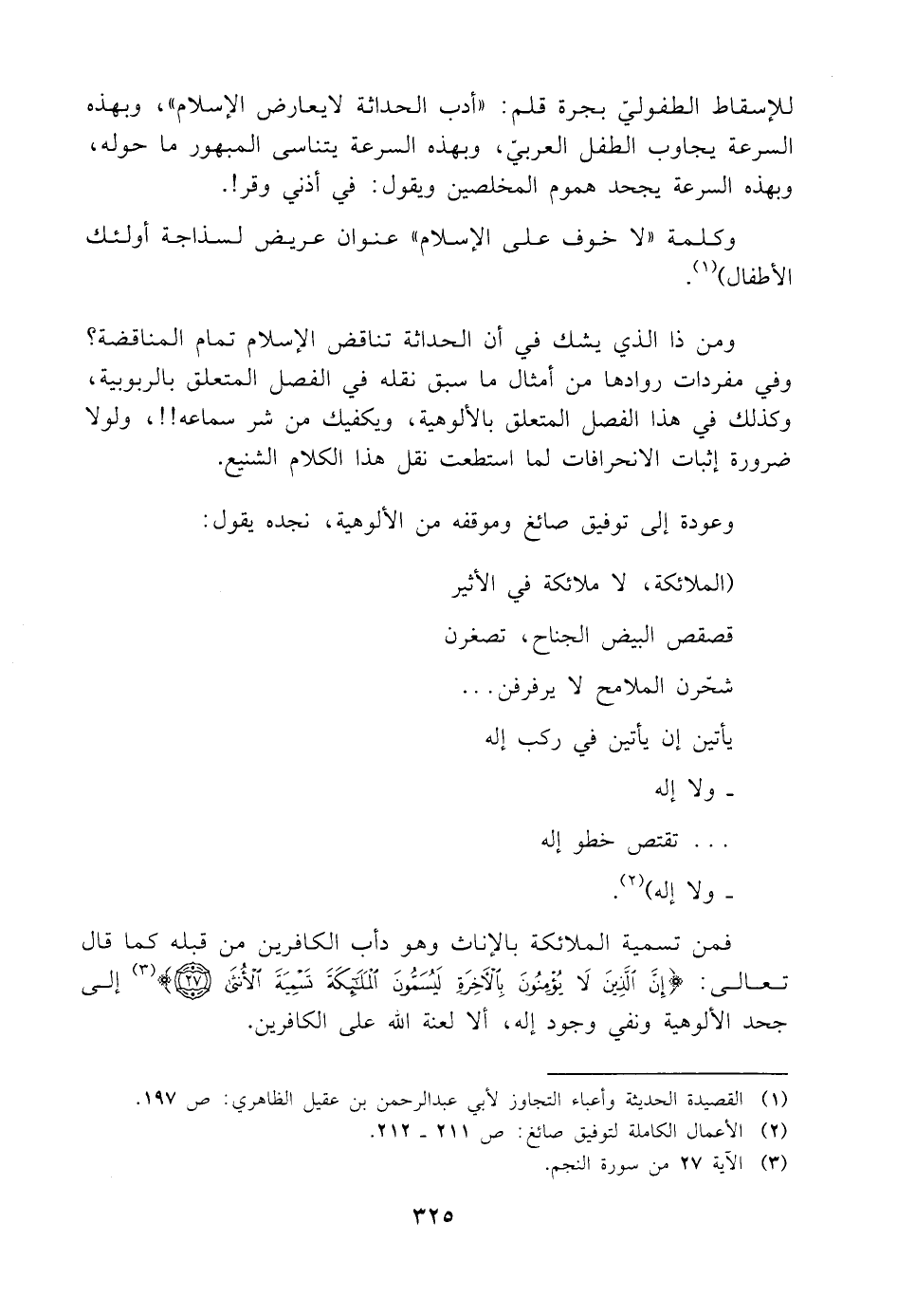 وعودة إلى توفيق صائغ وموقفه من الألوهية، نجده يقول: