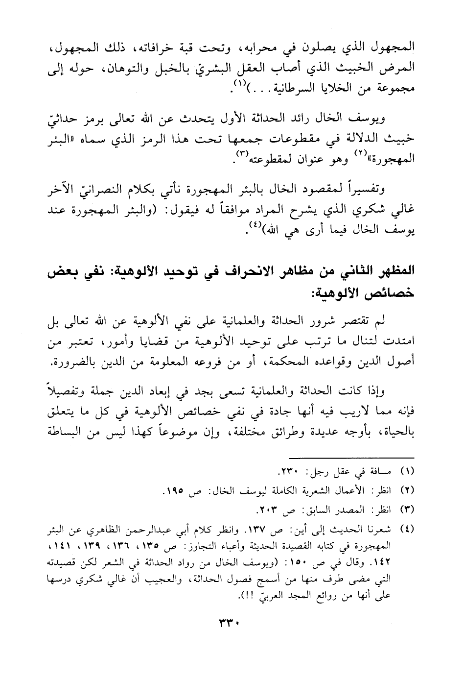 (¬٤) شعرنا الحديث إلى أين: ص ١٣٧. وانظر كلام أبي عبد الرحمن الظاهري عن البئر المهجورة في كتابه القصيدة الحديثة وأعباء التجاوز: ص ١٣٥، ١٣٦، ١٣٩، ١٤١، ١٤٢. وقال في ص ١٥٠: (ويوسف الخال من رواد الحداثة في الشعر لكن قصيدته التي مضى طرف منها من أسمج فصول الحداثة، والعجيب أن غالي شكري درسها على أنها من روائع المجد العربيّ! ! ).