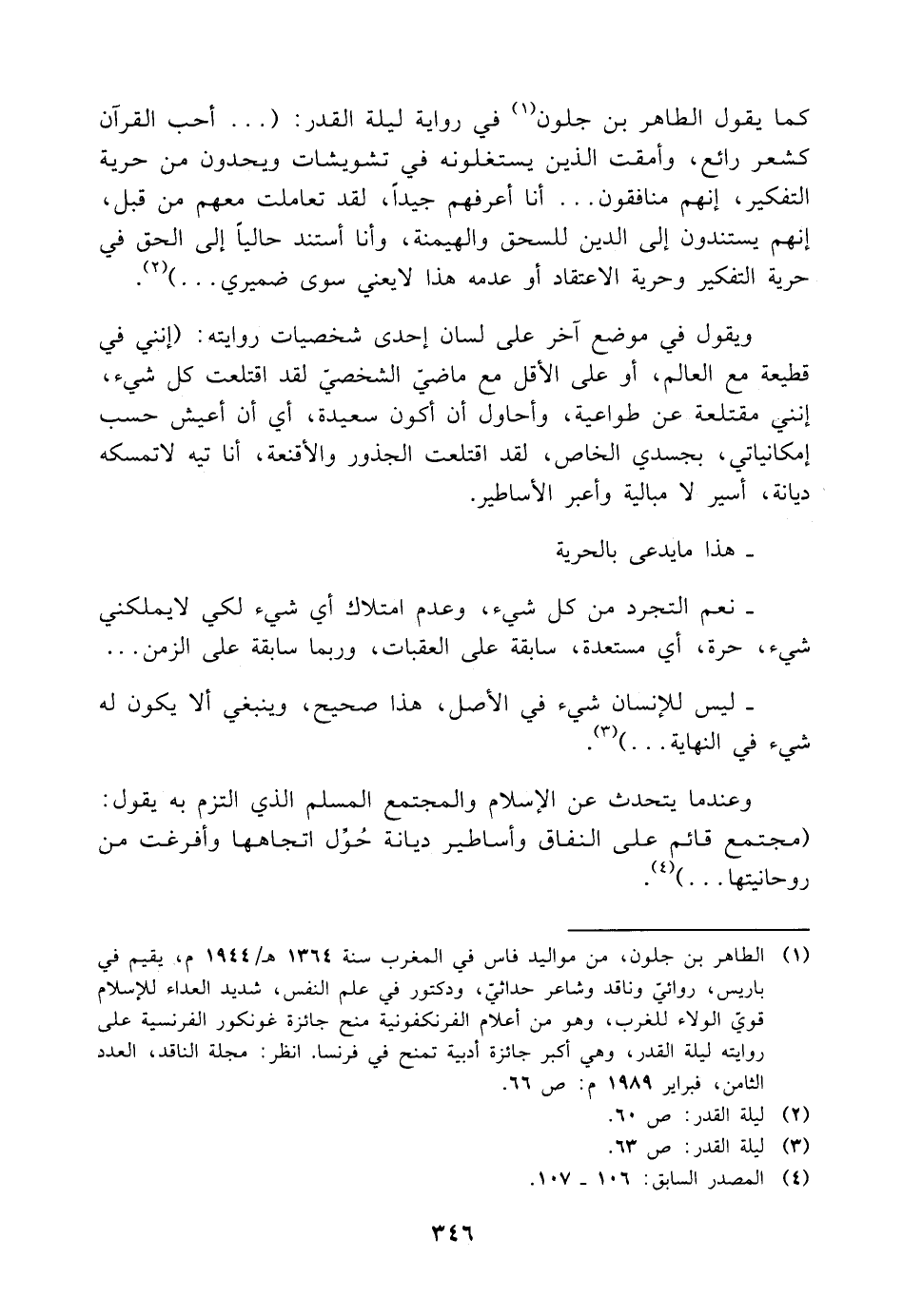 (¬١) الطاهر بن جلون، من مواليد فاس في المغرب سنة ١٣٦٤ هـ/ ١٩٤٤ م، يقيم في باريس، روائيّ وناقد وشاعر حداثيّ، ودكتور في علم النفس، شديد العداء للإسلام قويّ الولاء للغرب، وهو من أعلام الفرنكفونية منح جائزة غونكور الفرنسية على روايته ليلة القدر، وهي أكبر جائزة أدبية تمنح في فرنسا. انظر: مجلة الناقد، العدد الثامن، فبراير ١٩٨٩ م: ص ٦٦.