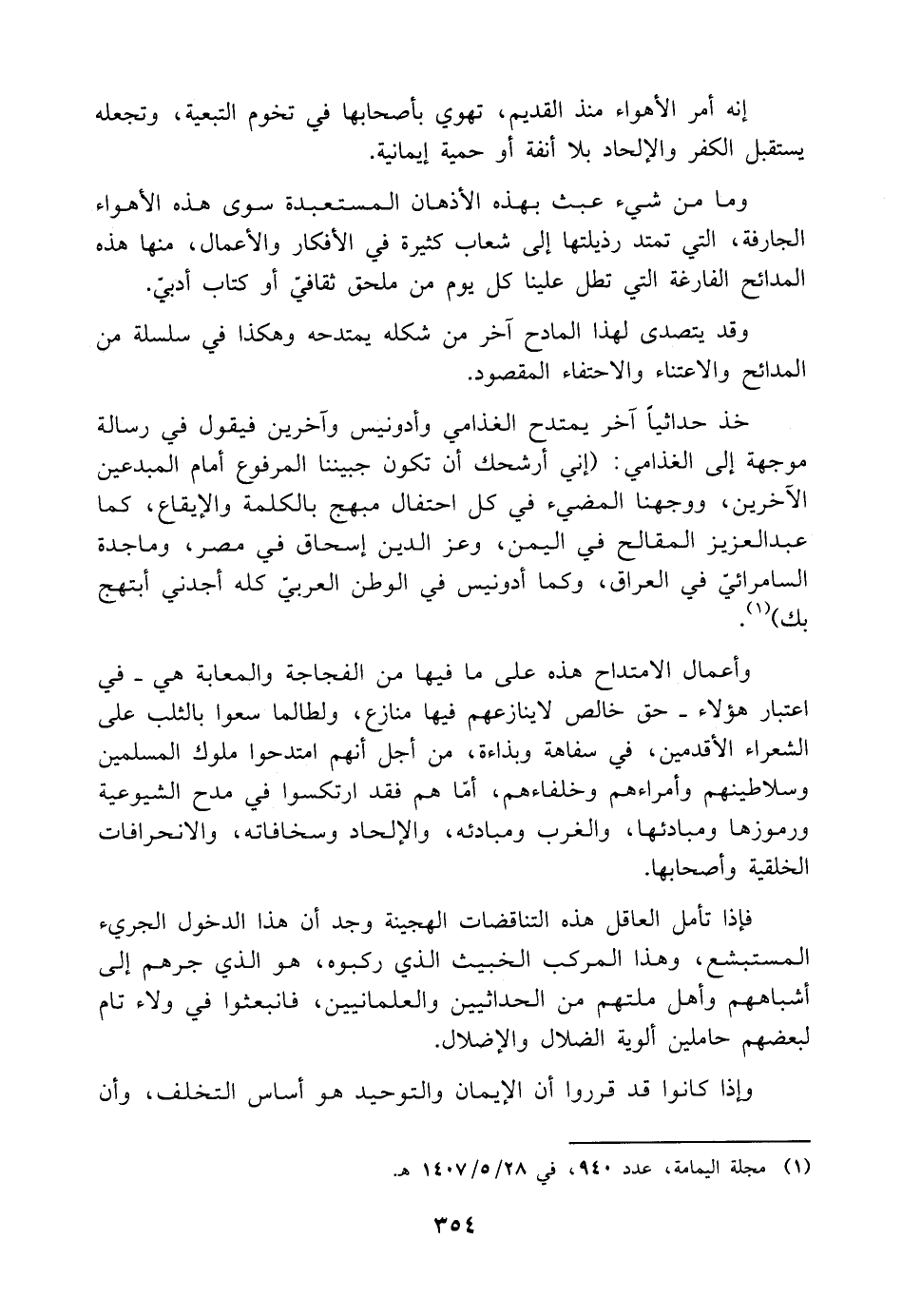 خذ حداثيًا آخر يمتدح الغذامي وأدونيس وآخرين فيقول في رسالة موجهة إلى الغذامي: (إني أرشحك أن تكون جبيننا المرفوع أمام المبدعين الآخرين، ووجهنا المضيء في كل احتفال مبهج بالكلمة والإيقاع، كما عبد العزيز المقالح في اليمن، وعز الدين إسحاق في مصر، وماجدة السامرائيّ في العراق، وكما أدونيس في الوطن العربيّ كله أجدني أبتهج بك) (¬١).