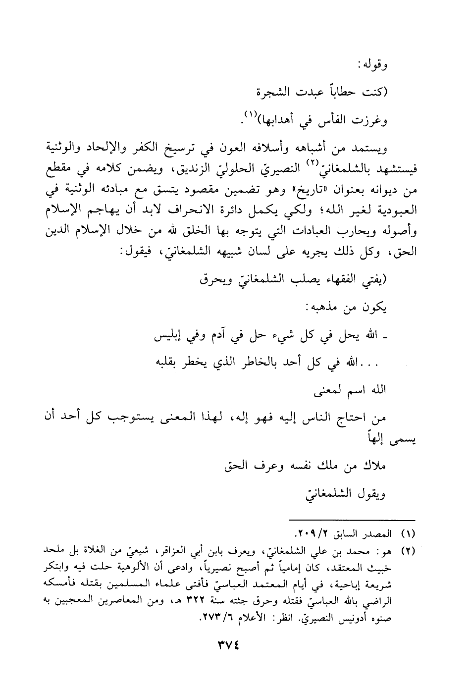 (¬٢) هو: محمد بن علي الشلمغانيّ، ويعرف بابن أبي العزاقر، شيعيّ من الغلاة بل ملحد خبيث المعتقد، كان إماميًا ثم أصبح نصيريًا، وادعى أن الألوهية حلت فيه واتكر شريعة إباحية، في أيام المعتمد العباسيّ فأفتى علماء المسلمين بقتله فأمسكه الراضي باللَّه العباسيّ فقتله وحرق جثته سنة ٣٢٢ هـ، ومن المعاصرين المعجبين به صنوه أدونيس النصيريّ. انظر: الأعلام ٦/ ٢٧٣.