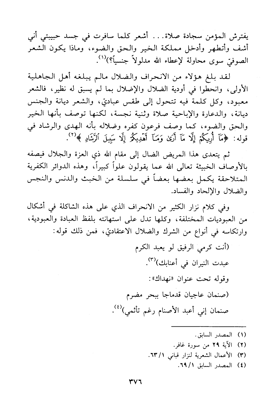لقد بلغ هؤلاء من الانحراف والضلال ما لم يبلغه أهل الجاهلية الأولى، وانحطوا في أودية الضلال والإضلال بما لم يسبق له نظير، فالشعر معبود، وكل كلمة فيه تتحول إلى طقس عباديّ، والشعر ديانة والجنس ديانة، والدعارة والإباحية صلاة وثنية نجسة، لكنها توصف بأنها الخير والحق والضوء، كما وصف فرعون كفره وضلاله بأنه الهدى والرشاد في قوله: {مَا أُرِيكُمْ إِلَّا مَا أَرَى وَمَا أَهْدِيكُمْ إِلَّا سَبِيلَ الرَّشَادِ} (¬٢).