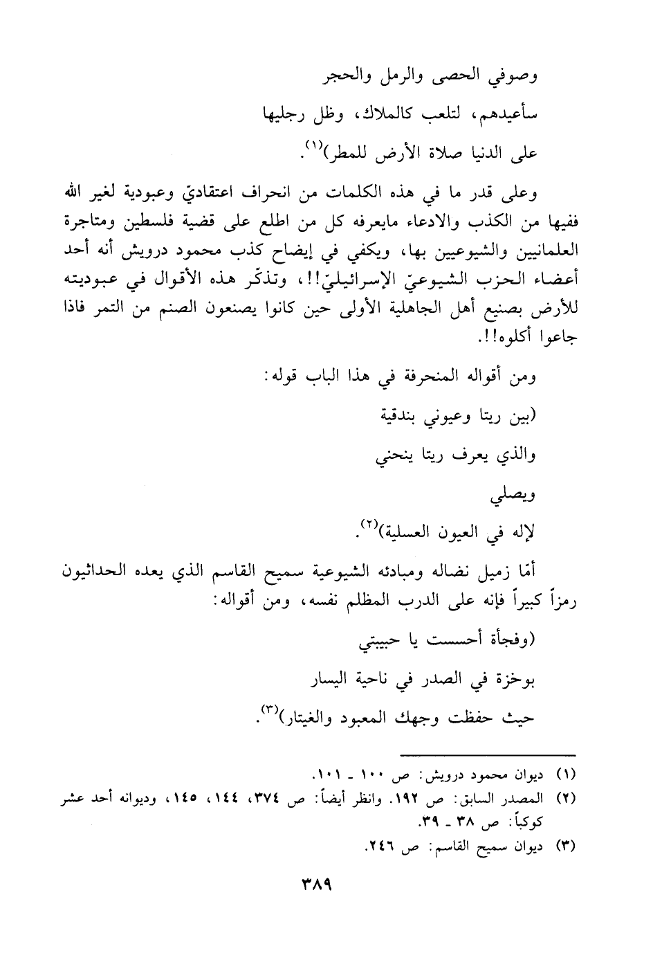 وعلى قدر ما في هذه الكلمات من انحراف اعتقاديّ وعبودية لغير اللَّه ففيها من الكذب والادعاء ما يعرفه كل من اطلع على قضية فلسطين ومتاجرة العلمانيين والشيوعيين بها، ويكفي في إيضاح كذب محمود درويش أنه أحد أعضاء الحزب الشيوعيّ الإسرائيليّ! ! ، وتذكّر هذه الأقوال في عبوديته للأرض بصنيع أهل الجاهلية الأولى حين كانوا يصنعون الصنم من التمر فإذا جاعوا أكلوه! ! .