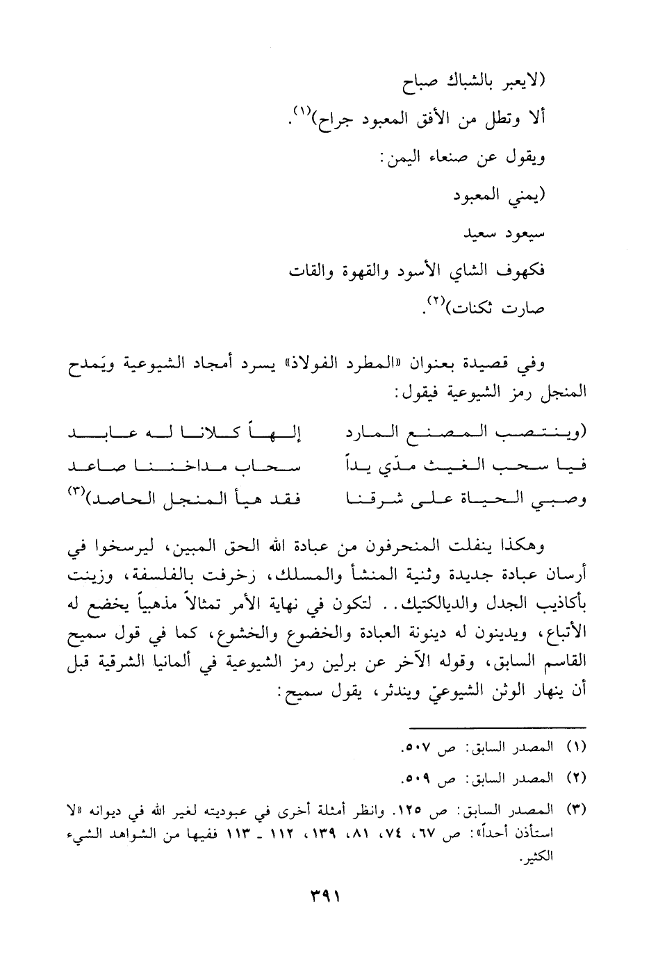 وهكذا ينفلت المنحرفون من عبادة اللَّه الحق المبين، ليرسخوا في أرسان عبادة جديدة وثنية المنشأ والمسلك، زخرفت بالفلسفة، وزينت بأكاذيب الجدل والديالكتيك. . لتكون في نهاية الأمر تمثالًا مذهبيًا يخضع له الأتباع، ويدينون له دينونة العبادة والخضوع والخشوع، كما في قول سميح القاسم السابق، وقوله الآخر عن برلين رمز الشيوعية في ألمانيا الشرقية قبل أن ينهار الوثن الشيوعيّ ويندثر، يقول سميح: