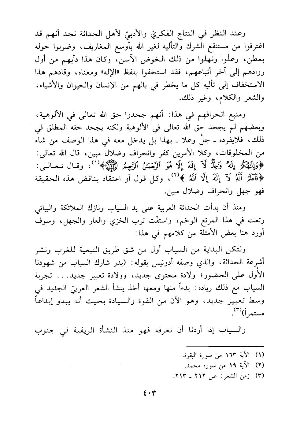 وعند النظر في النتاج الفكريّ والأدبيّ لأهل الحداثة نجد أنهم قد اغترفوا من مستنقع الشرك والتأليه لغير اللَّه بأوسع المغاريف، وضربوا حوله بعطن، وعلّوا ونهلوا من ذلك الخوض الآسن، وكان هذا دأبهم من أول روادهم إلى آخر أتباعهم، فقد استخفوا بلفظ "الإله" ومعناه، وقادهم هذا الاستخفاف إلى تأليه كل ما يخطر في بالهم من الإنسان والحيوان والأشياء، والشعر والكلام، وغير ذلك.