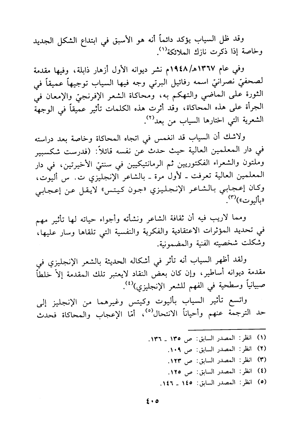 واتسع تأثير السياب بأليوت وكيتس وغيرهما من الإنجليز إلى حد الترجمة عنهم وأحيانًا الانتحال (¬٥)، أمّا الإعجاب والمحاكاة فحدث