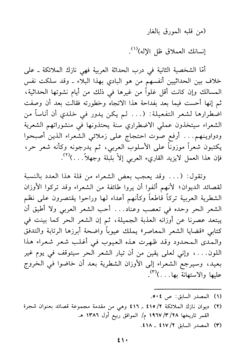 (¬٢) ديوان نازك الملائكة ٢/ ٤١٥ - ٤١٦ وهي من مقدمة مجموعة قصائد بعنوان شجرة القمر تاريخها ٢٨/ ٣/ ١٩٦٧ م/ الموافق ربيع أول ١٣٨٦ هـ.