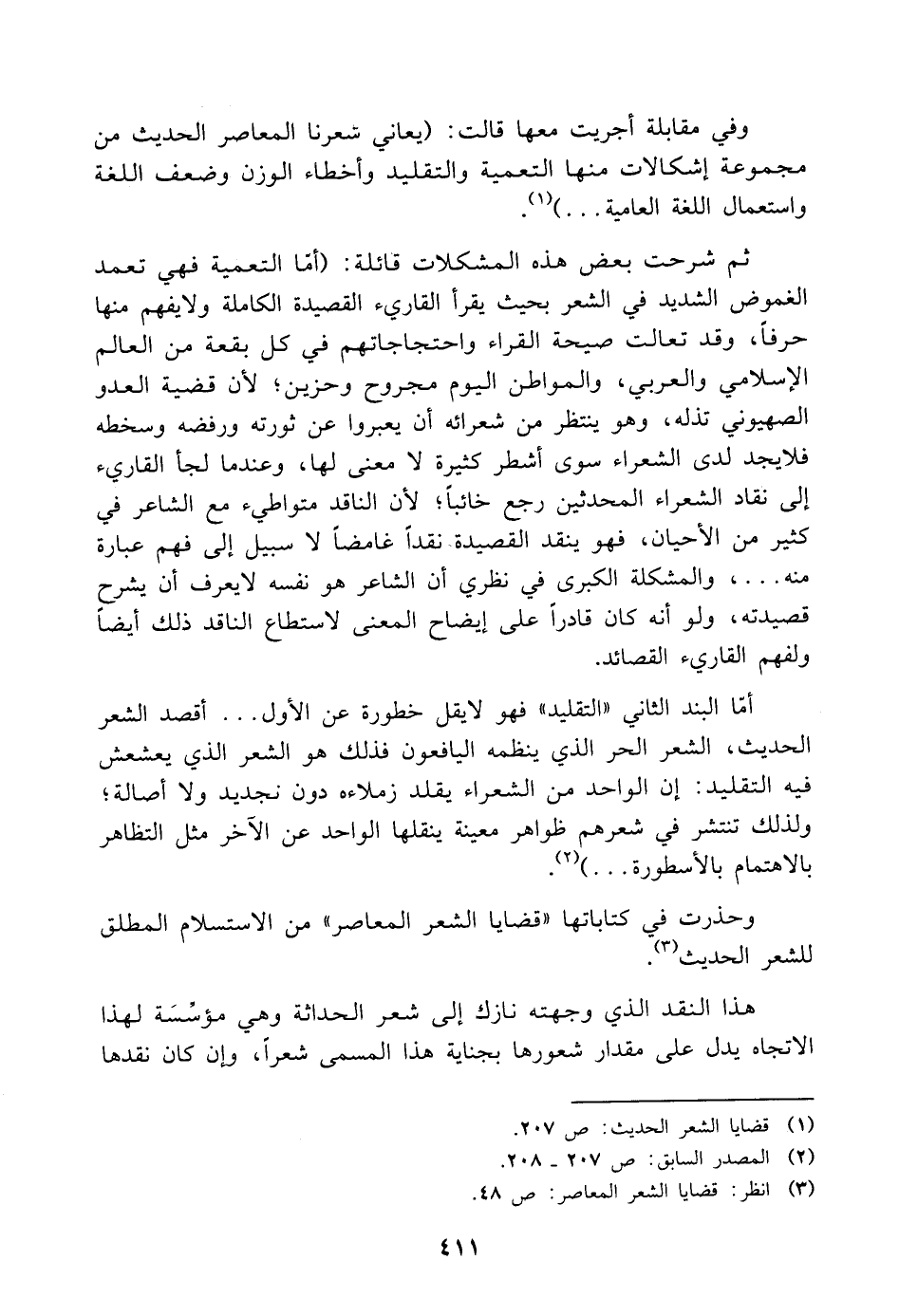 وحذرت في كتاباتها "قضايا الشعر المعاصر" من الاستسلام المطلق للشعر الحديث (¬٣).