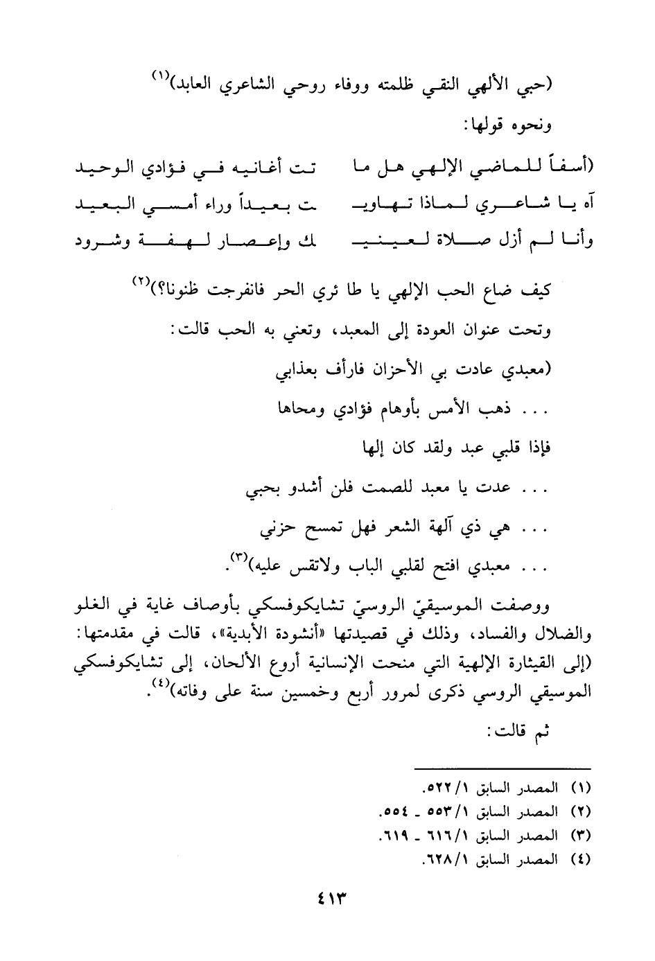 ووصفت الموسيقي الروسيّ تشايكوفسكي بأوصاف غاية في الغلو والضلال والفساد، وذلك في قصيدتها "أنشودة الأبدية"، قالت في مقدمتها: (إلى القيثارة الإلهية التي منحت الإنسانية أروع الألحان، إلى تشايكوفسكي الموسيقي الروسي ذكرى لمرور أربع وخمسين سنة على وفاته) (¬٤).