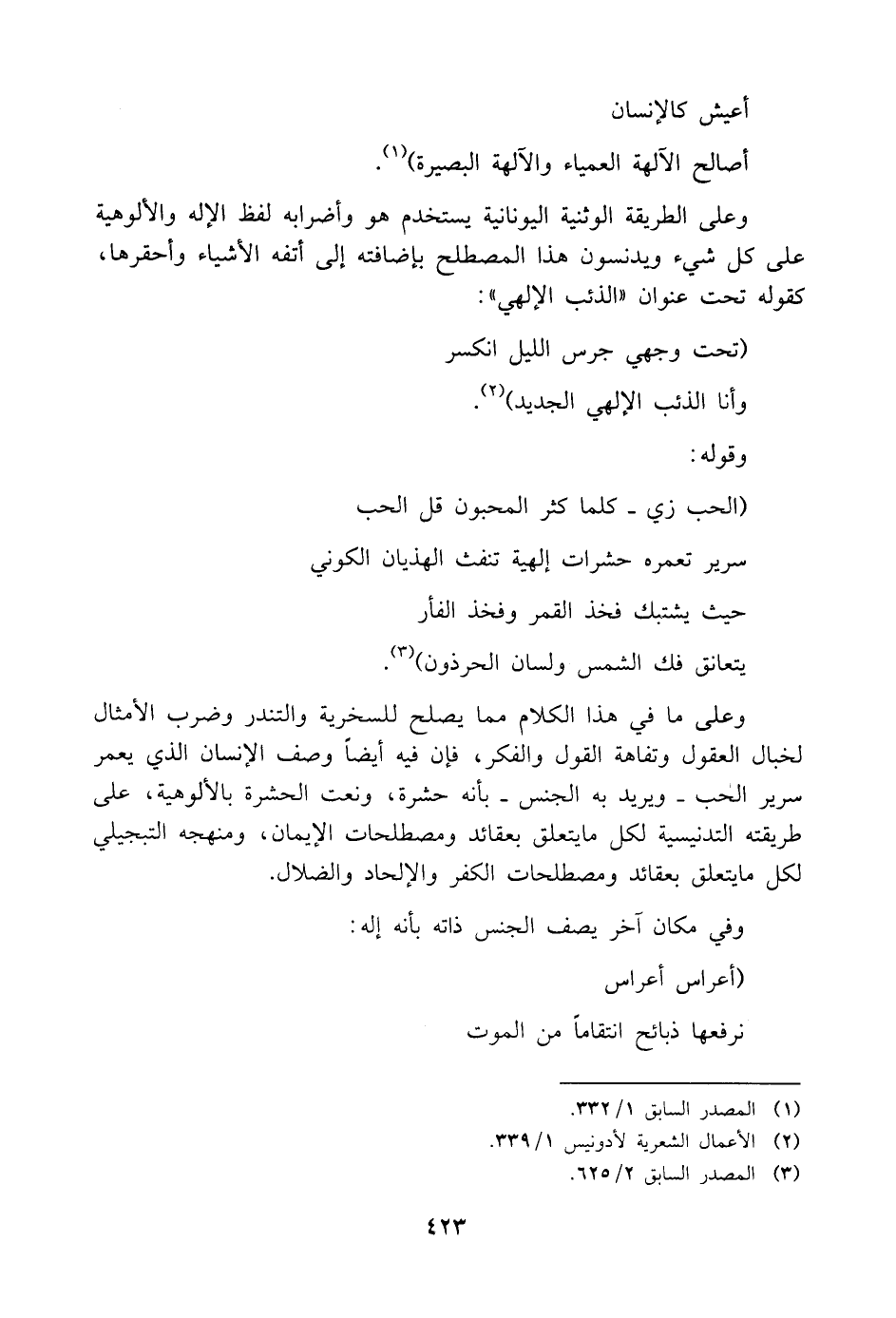 وعلى الطريقة الوثنية اليونانية يستخدم هو وأضرابه لفظ الإله والألوهية على كل شيء ويدنسون هذا المصطلح بإضافته إلى أتفه الأشياء وأحقرها، كقوله تحت عنوان "الذئب الإلهي":