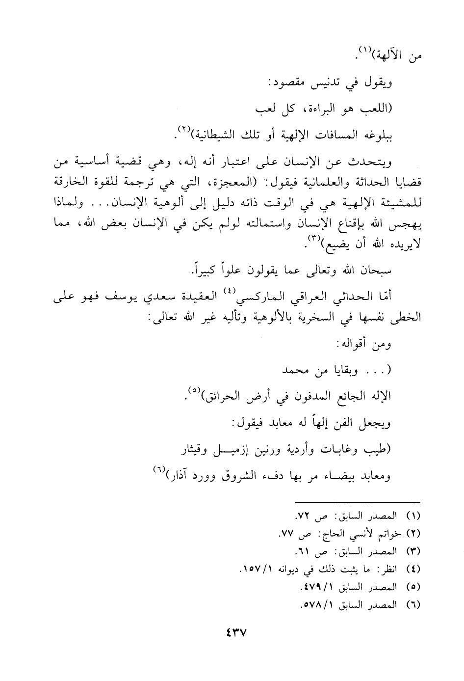 أمّا الحداثي العراقي الماركسي (¬٤) العقيدة سعدي يوسف فهو على الخطى نفسها في السخرية بالألوهية وتأليه غير اللَّه تعالى: