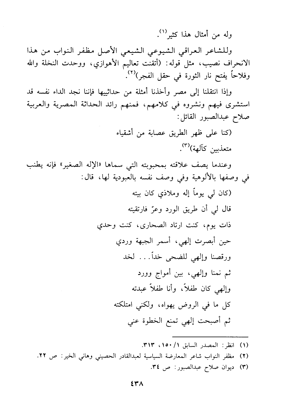وللشاعر العراقي الشيوعي الشيعي الأصل مظفر النواب من هذا الانحراف نصيب، مثل قوله: (أتقنت تعاليم الأهوازي، ووحدت النخلة واللَّه وفلاحًا يفتح نار الثورة في حقل الفجر) (¬٢).