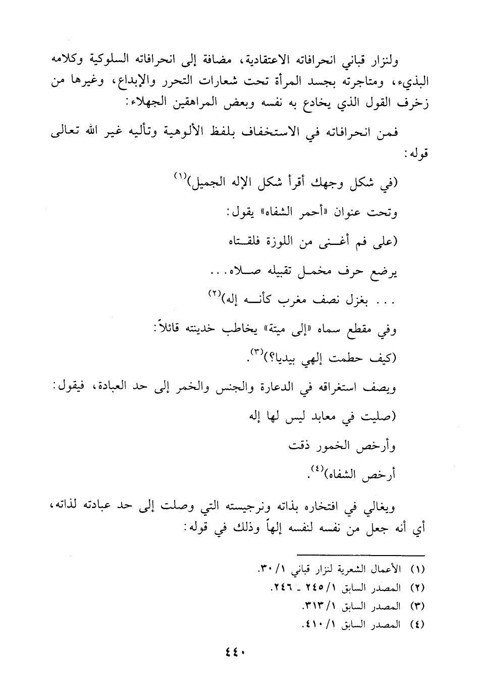 ولنزار قباني انحرافاته الاعتقادية، مضافة إلى انحرافاته السلوكية وكلامه البذيء، ومتاجرته بجسد المرأة تحت شعارات التحرر والإبداع، وغيرها من زخرف القول الذي يخادع به نفسه وبعض المراهقين الجهلاء: