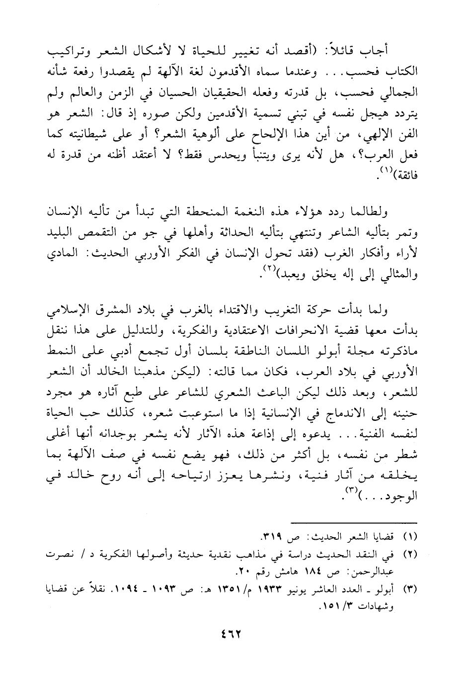 (¬٣) أبولو - العدد العاشر يونيو ١٩٣٣ م/ ١٣٥١ هـ: ص ١٠٩٣ - ١٠٩٤. نقلًا عن قضايا وشهادات ٣/ ١٥١.